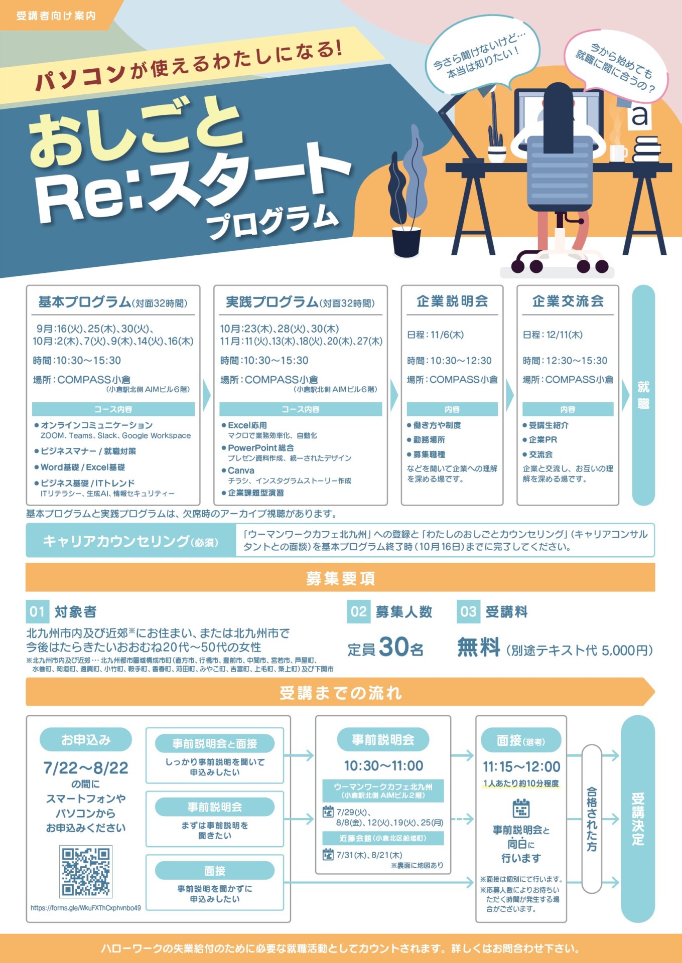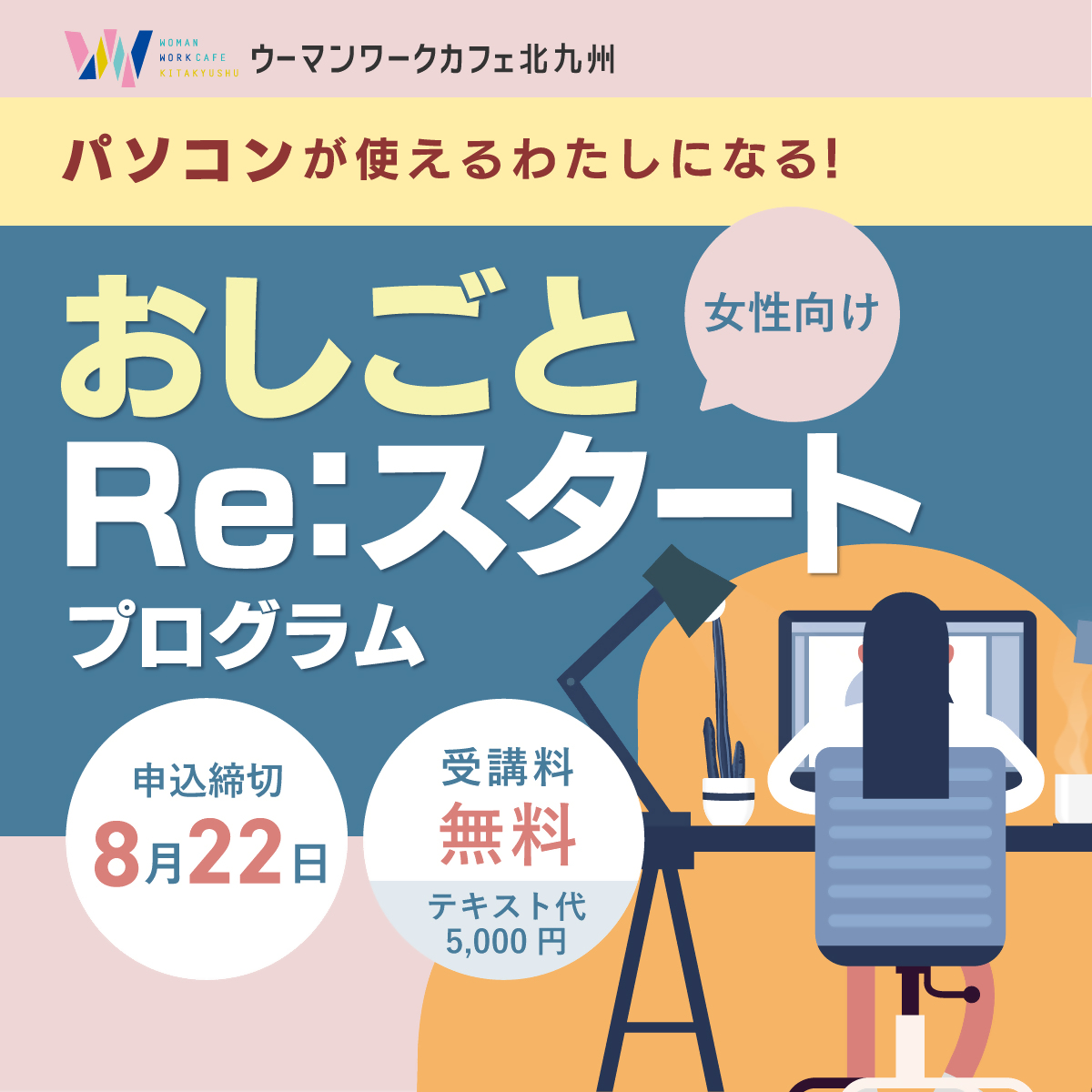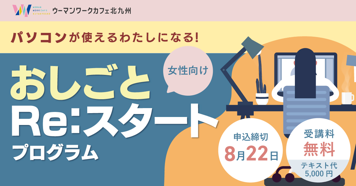 • 【北九州で女性の再就職・転職を応援!】スキルを基礎から習得「パソコンが使える私になる!おしごとRe:スタートプログラム」初開催<ウーマンワークカフェ北九州>