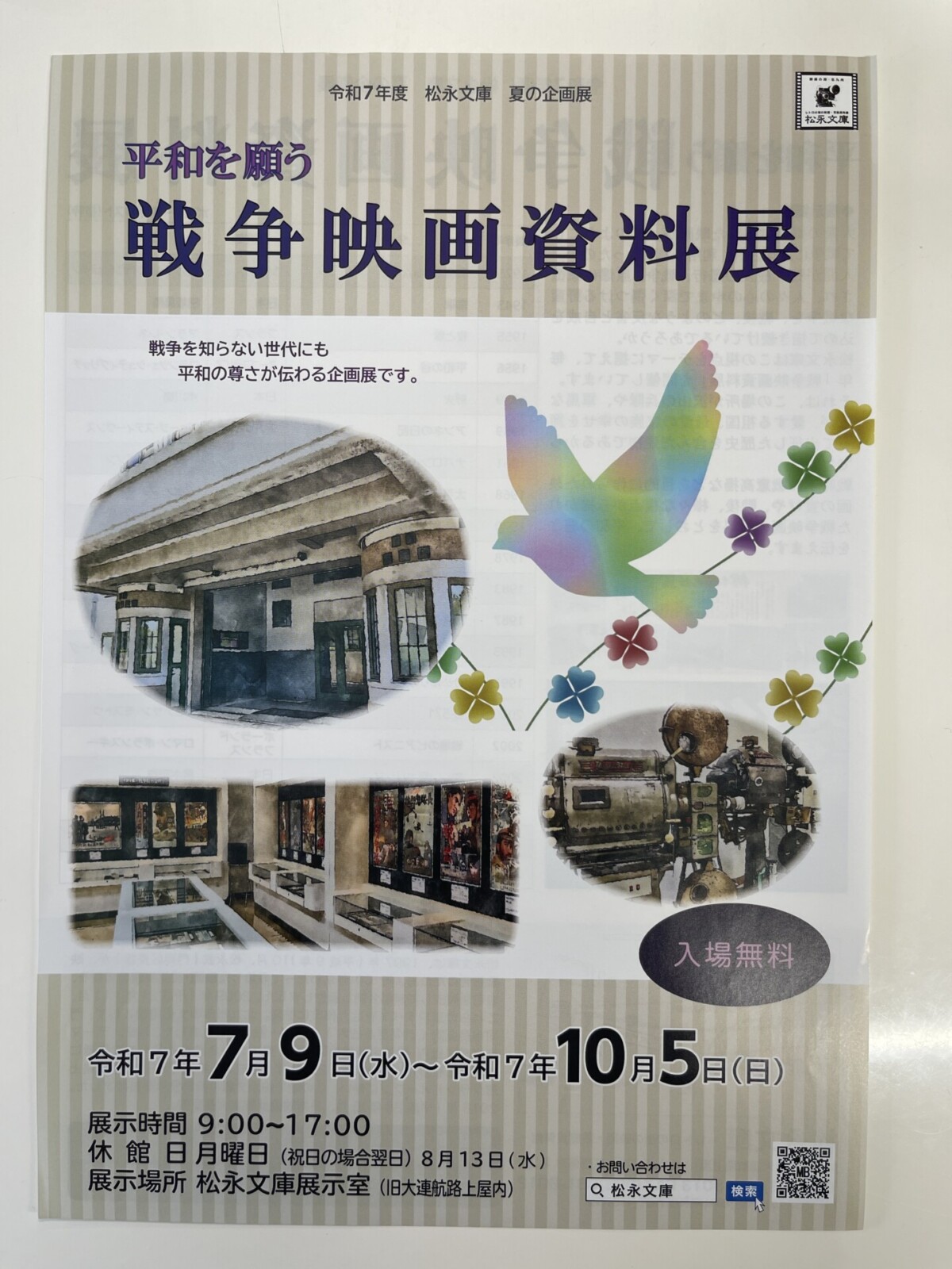 JR門司港駅から徒歩5分ほど旧大連航路上屋1階にある「松永文庫」展示室では現在、「平和を願う戦争映画資料展」が開催されています。期間は10月5日まで。