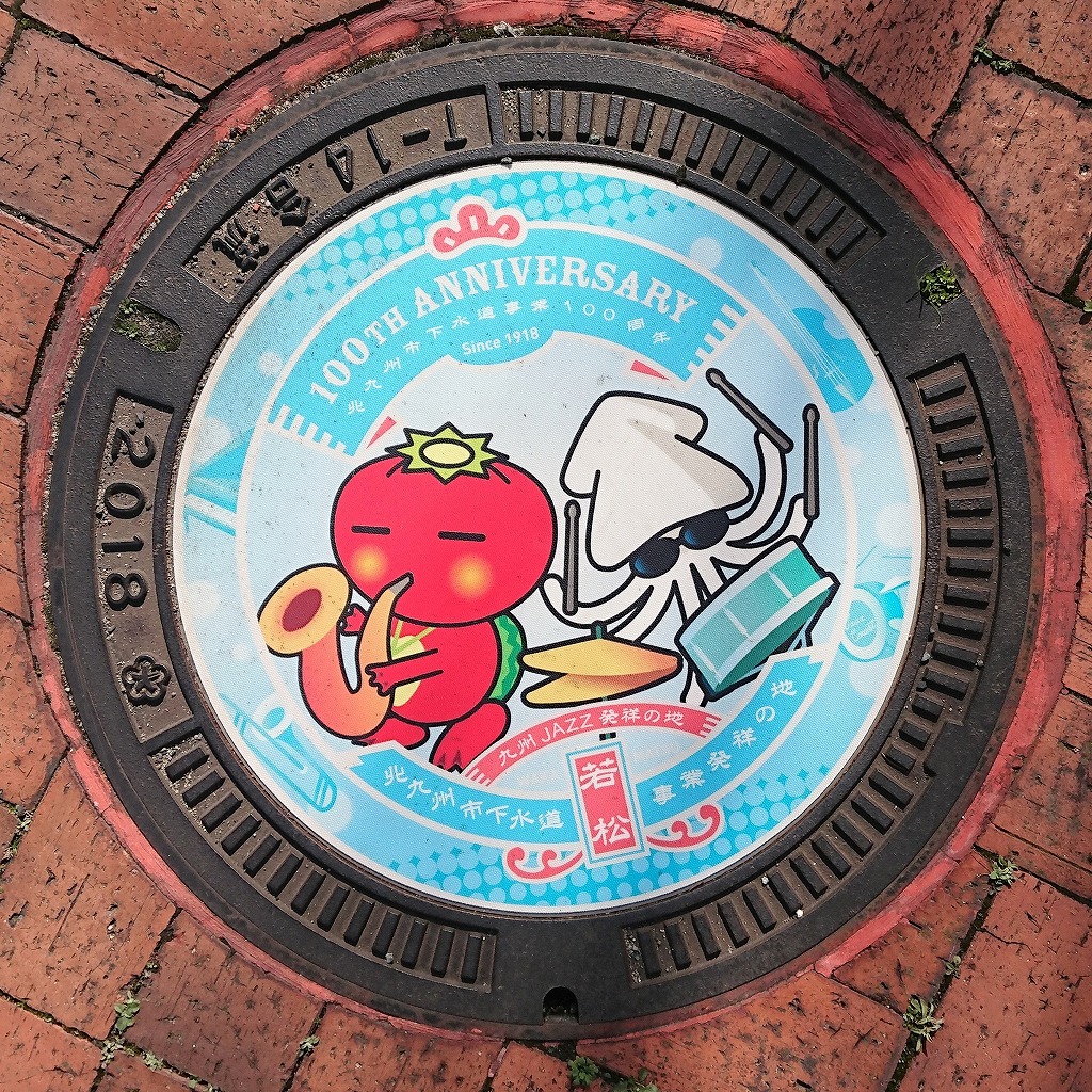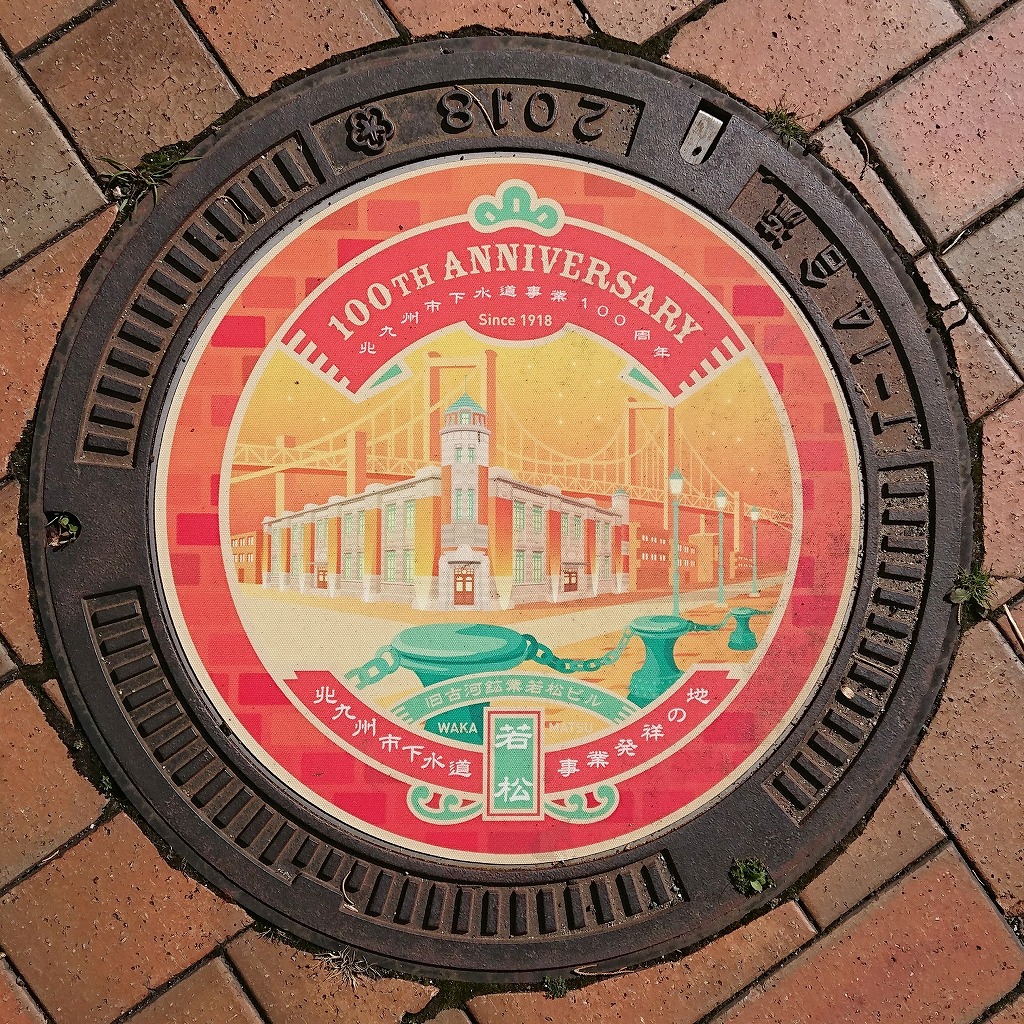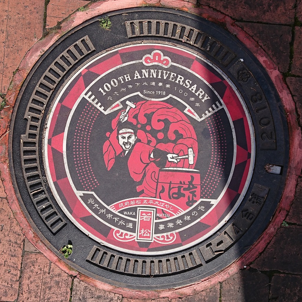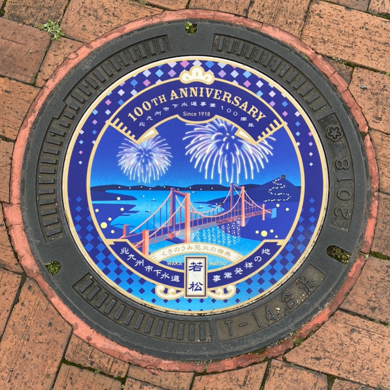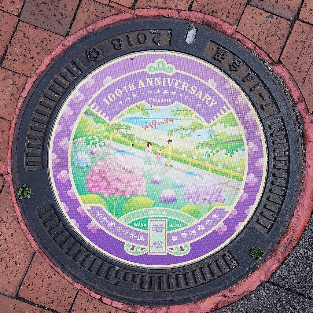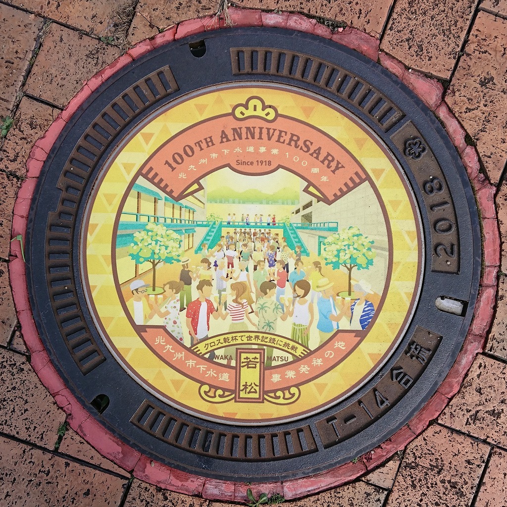 若松区中心部の中川通り周辺の歩道を歩いていると、若松区の特色を活かした6種類のデザインマンホールを見つけることができます。このデザインマンホールは、平成30年度の北九州市下水道100周年を記念して、北九州市の下水道発祥の地である若松区に、2018年に設置されたものです。