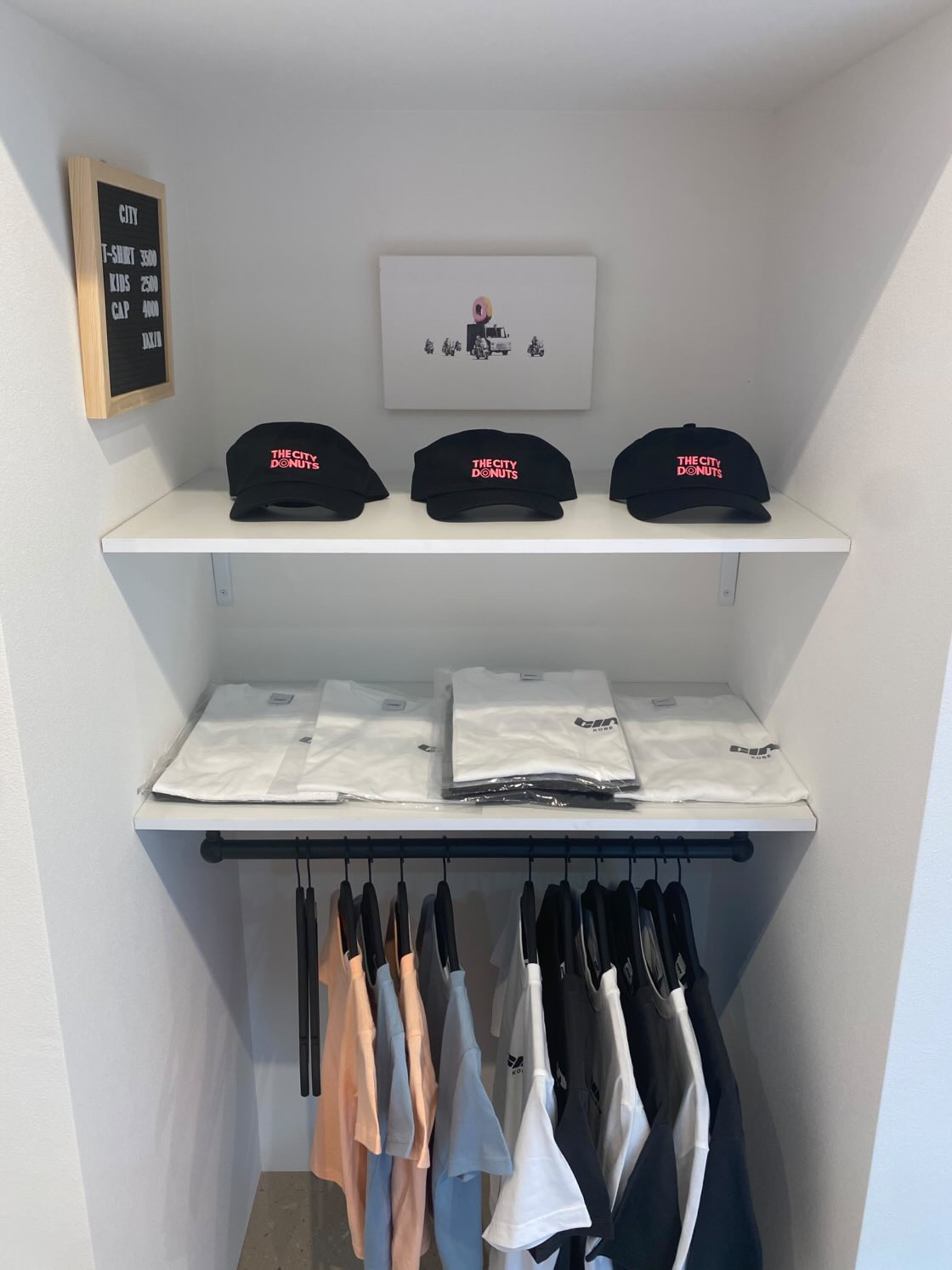 店内には、「THE CITY DONUTS」オリジナルブランド「CITY」のアパレルも販売。Tシャツをはじめ、トートバッグやキャップなどを取り揃えています。