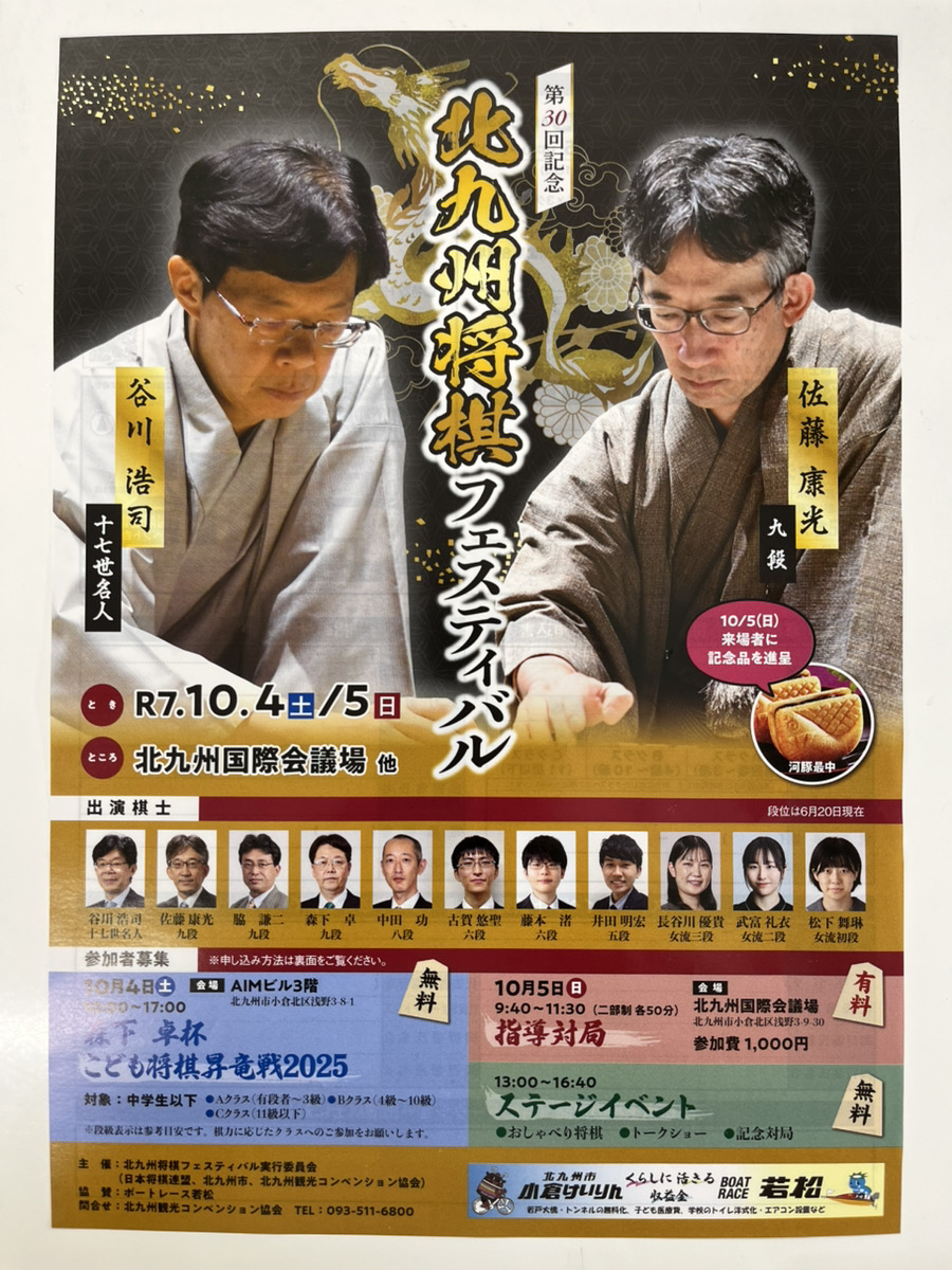 北九州市国際会議場(北九州市小倉北区浅野3-9-30)などの会場で10月4日と5日の2日間、「第30回北九州将棋フェスティバル」が開催されます。