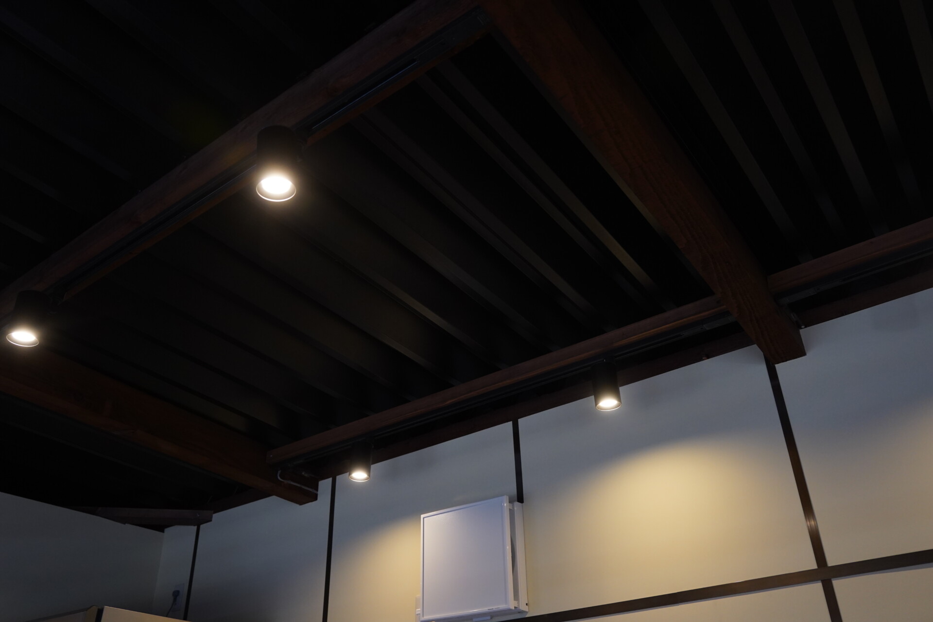 内装は古民家カフェのような開放感。天井を抜き、梁をむき出しにして塗装することで、温かみのある茶色とオレンジのライトが落ち着いた空間を演出しています。