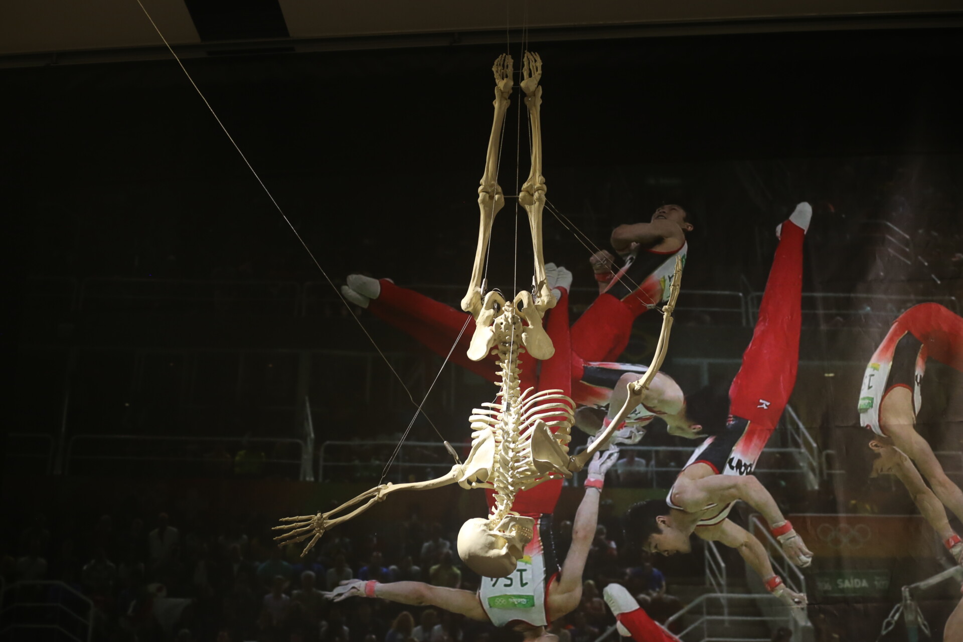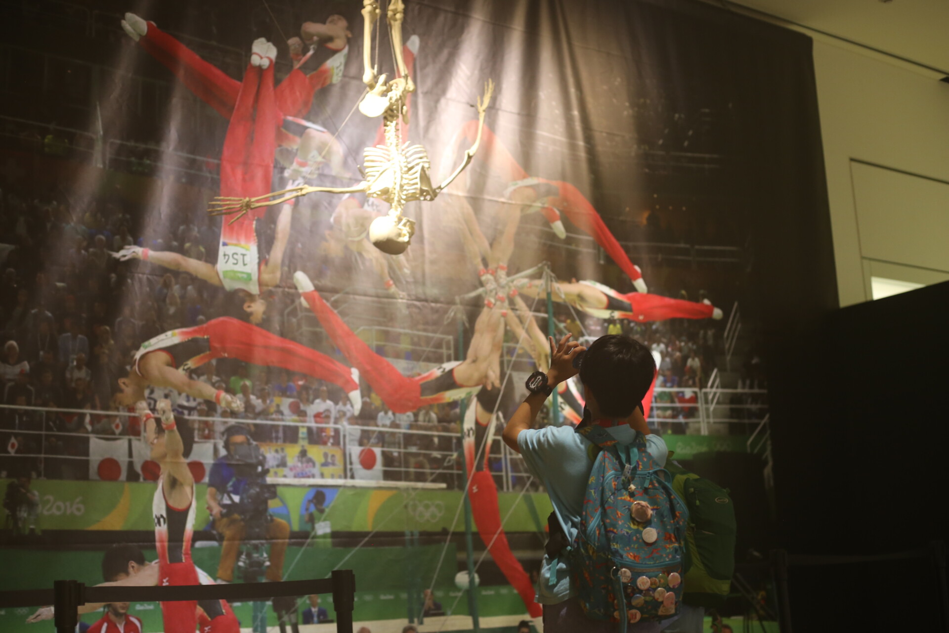 北九州市スポーツ大使でもある内村航平さんに依頼して、鉄棒で着地へ向かう一瞬の骨の様子を切り取って再現しているといいます。