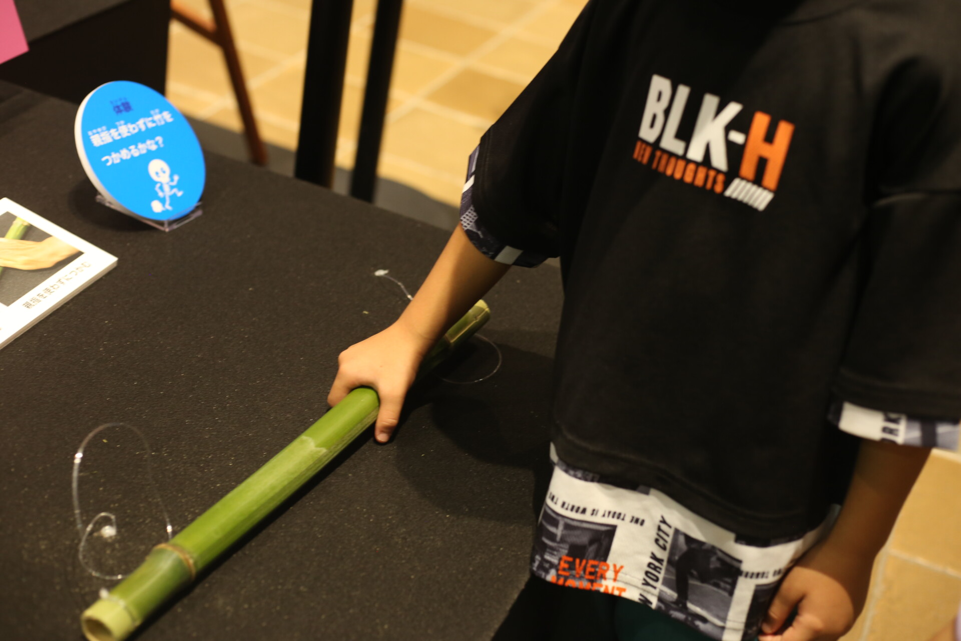 このコーナーでは、パンダのように親指をつかわずに竹を持つことができるか実際に体験できる展示もあって、子どもたちも楽しそうに挑戦していました。