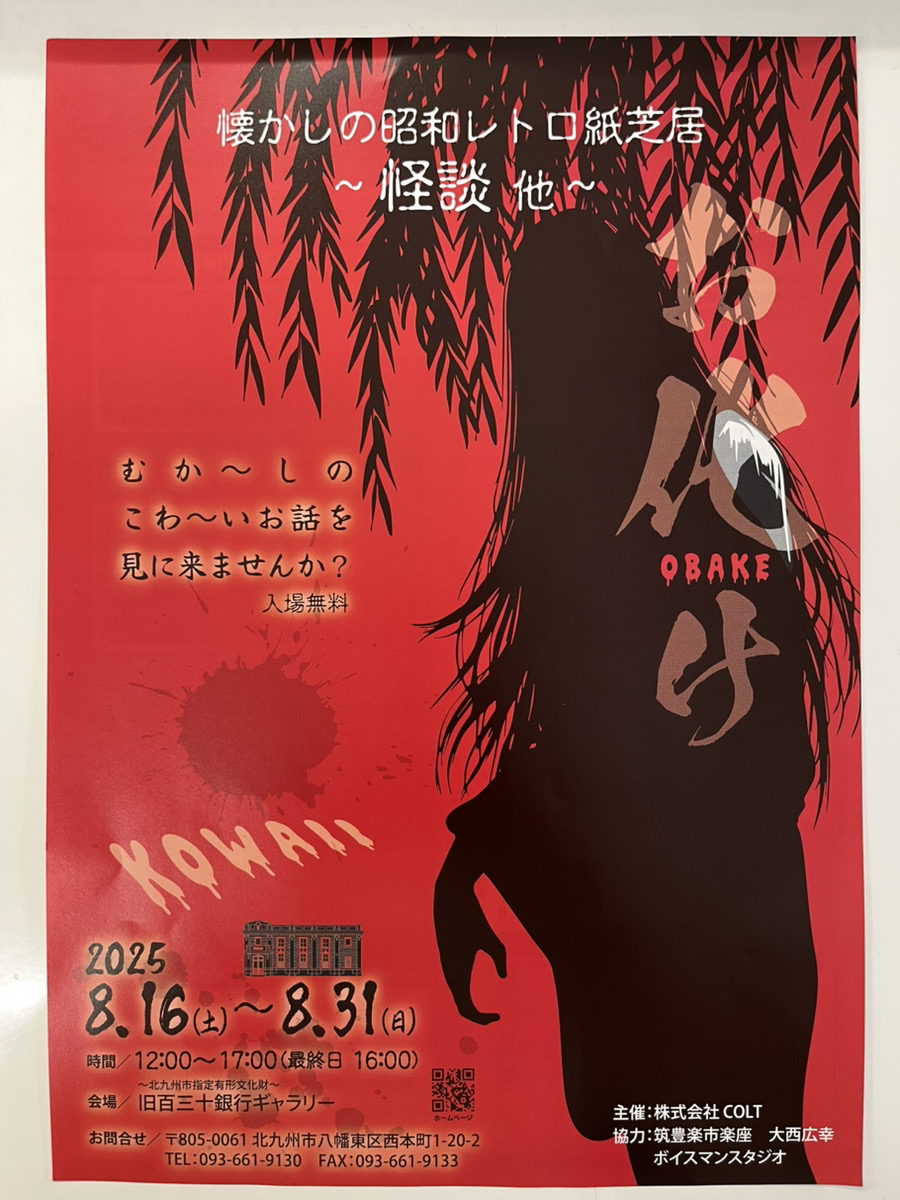 旧百三十銀行ギャラリー(北九州市八幡東区西本町1‐20‐2)で現在、「昭和レトロ紙芝居 お化け展」が開催中です。