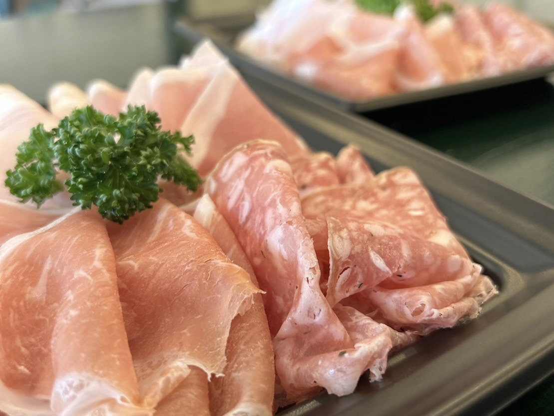 店頭では、ヨーロッパを中心に国産を含む種類豊富な生ハムやサラミ、加熱ハムなどを注文を受けてからスライサーでカットして、切りたてを販売します。