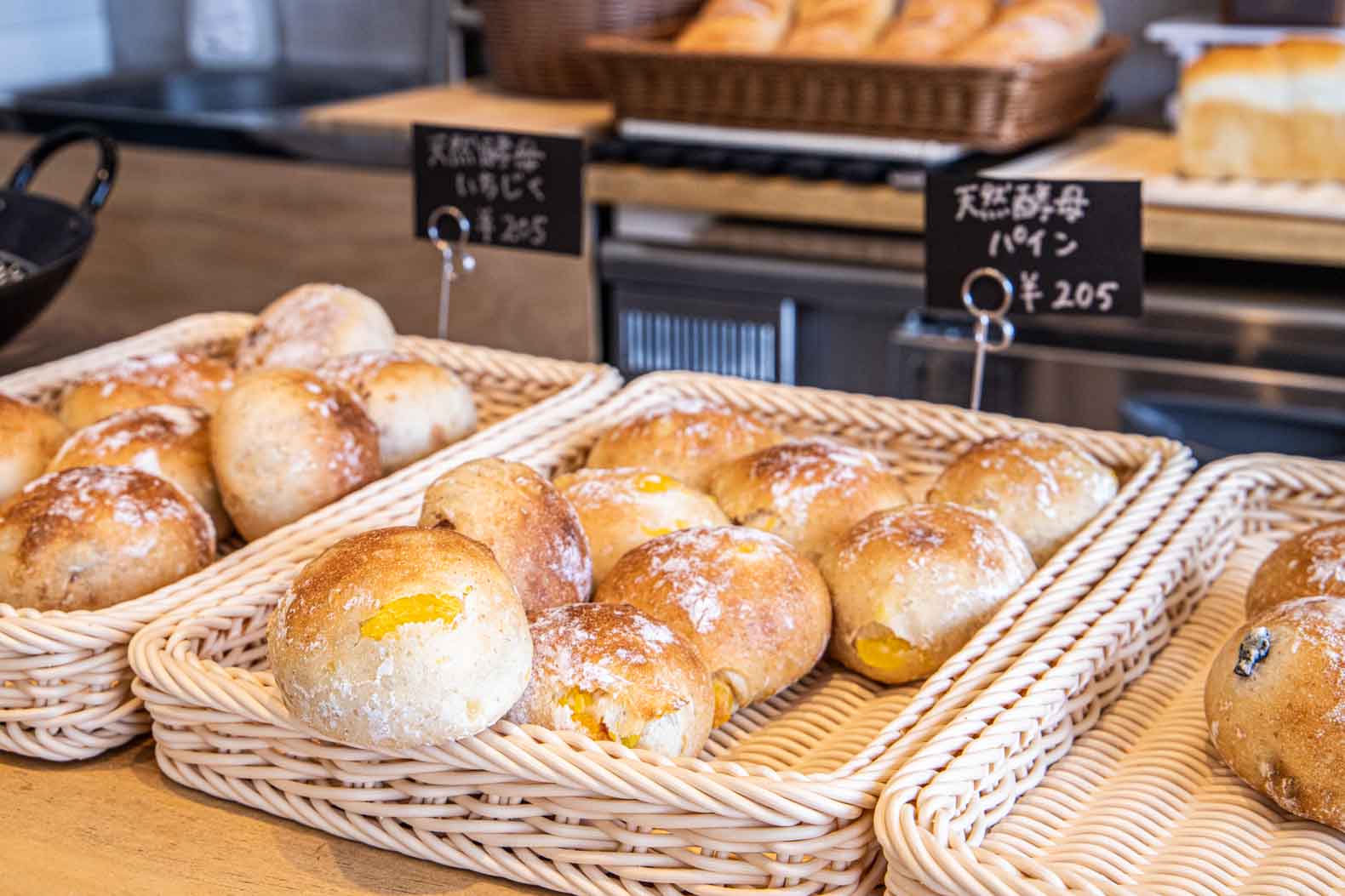 商品の中には、数量限定ですが天然酵母で作られたパンも数種類あります。取材日は「イチジク」「パイナップル」「オリーブ」(各205円)が焼き上がっていました。今後、この天然酵母を使った商品も増やしていくそうです。天然酵母シリーズのラインアップなどは「T.N.T BAKERY」インスタグラムで見ることができます。