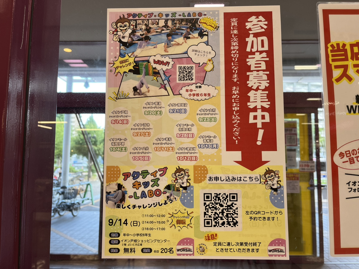 イオン戸畑(北九州市戸畑区汐井町2-2)の2階・よいとさ広場で9月14日、運動能力向上を図るイベント「アクティブキッズLABO」が開催されます。