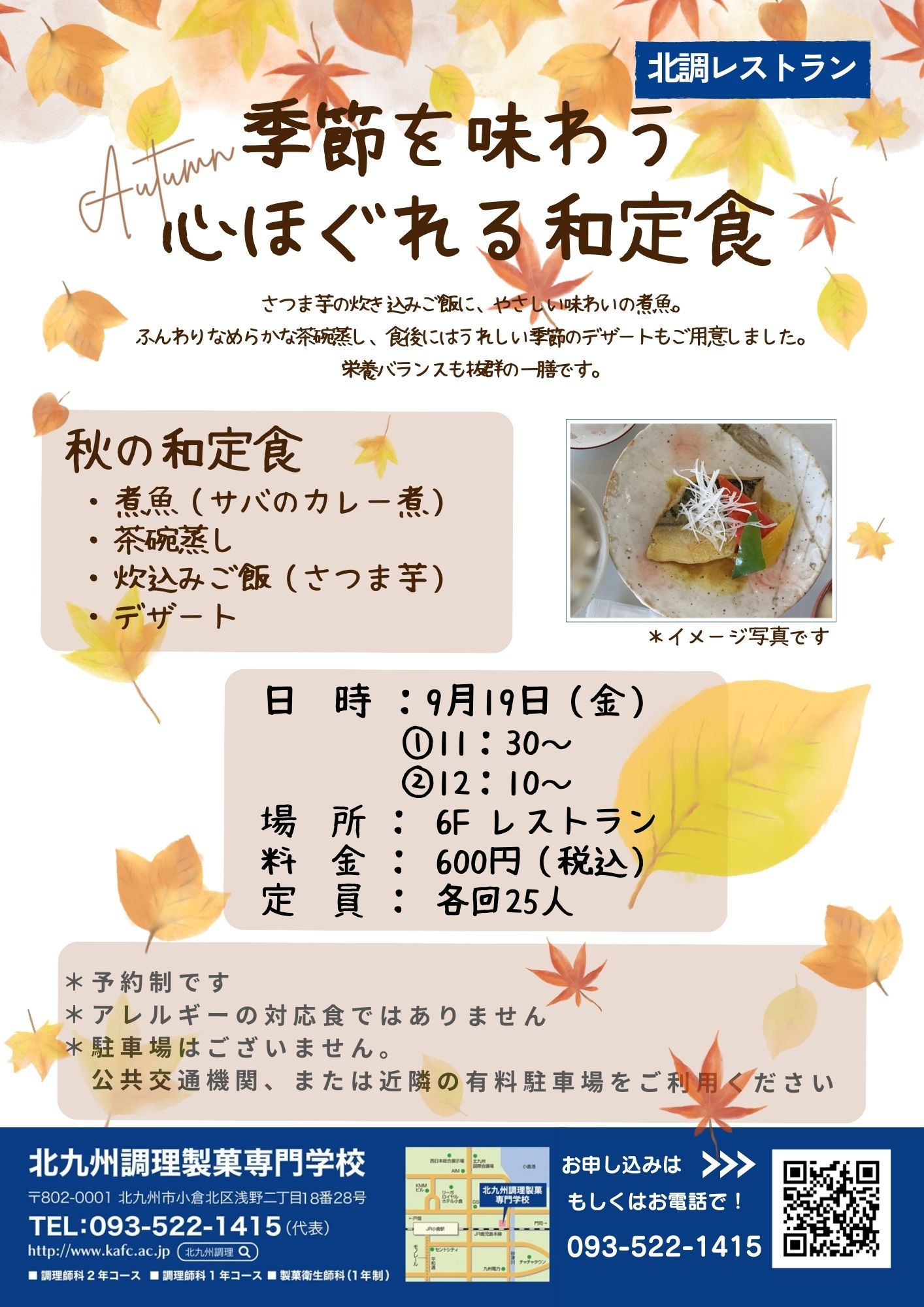 9月19日(金)、北九州調理製菓専門学校がランチイベント「北調レストラン」を開催します。今回は、秋の味覚をふんだんに使った和定食を600円(税込)で提供します。メニューは、栄養バランスを考えた「さつま芋の炊き込みご飯」「茶碗蒸し」「サバのカレー煮」、さらにデザートもついています。このレストランは調理師科2年コースの1年生が、初めてお客様をお迎えして調理を担当する特別なイベントです。この機会に、学生たちの真心を込めた料理をぜひお楽しみください。完全予約制ですので、ご予約はお電話または専用フォームからお願いいたします。