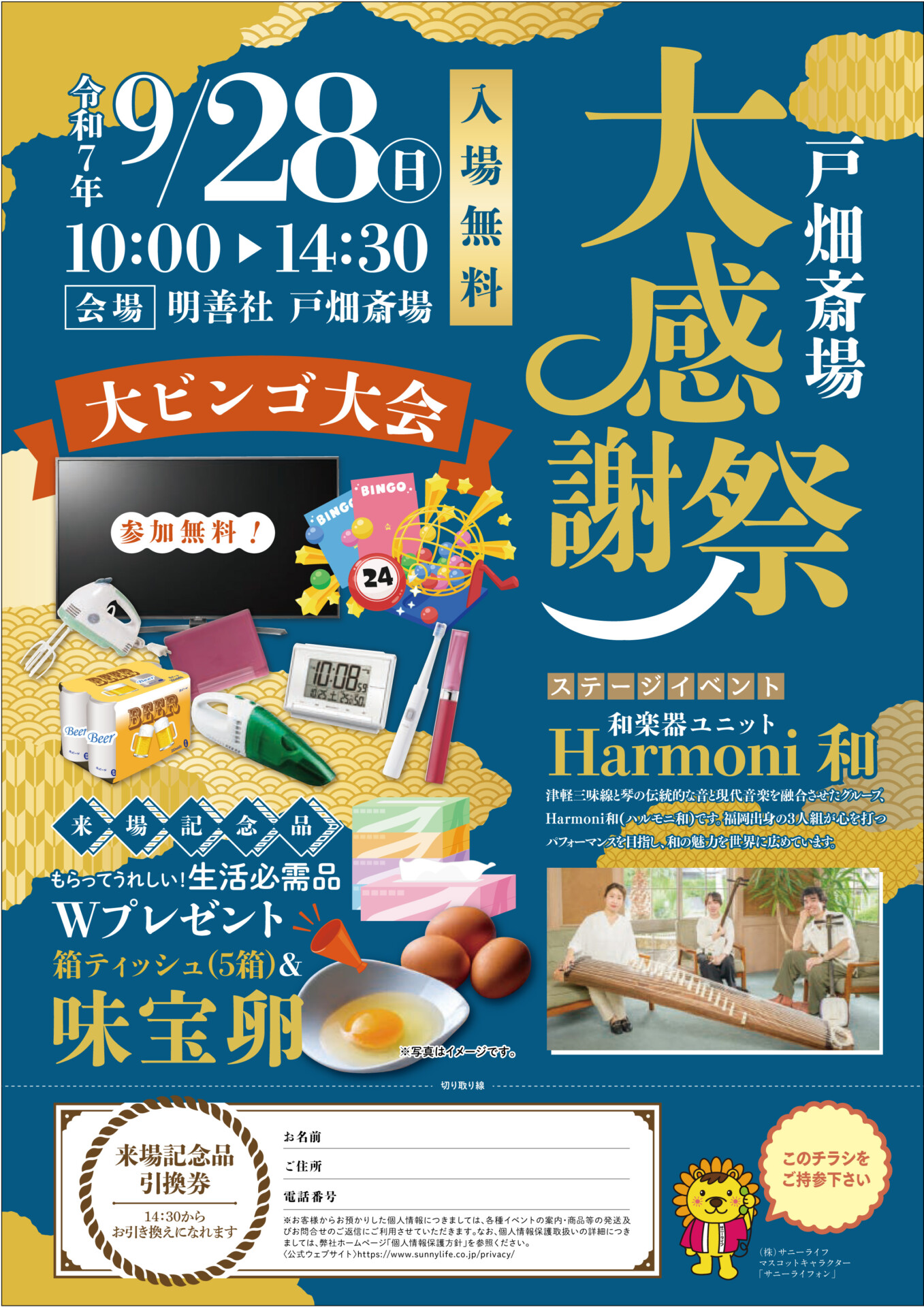 2025年9月28日(日)10:00~14:30、明善社 戸畑斎場にて「大感謝祭」を開催いたします!受付で「北九州ノコトを見た」とお伝えいただいた方には、サニーライフォンオリジナルグッズをプレゼント!ぜひお気軽にお越しください!