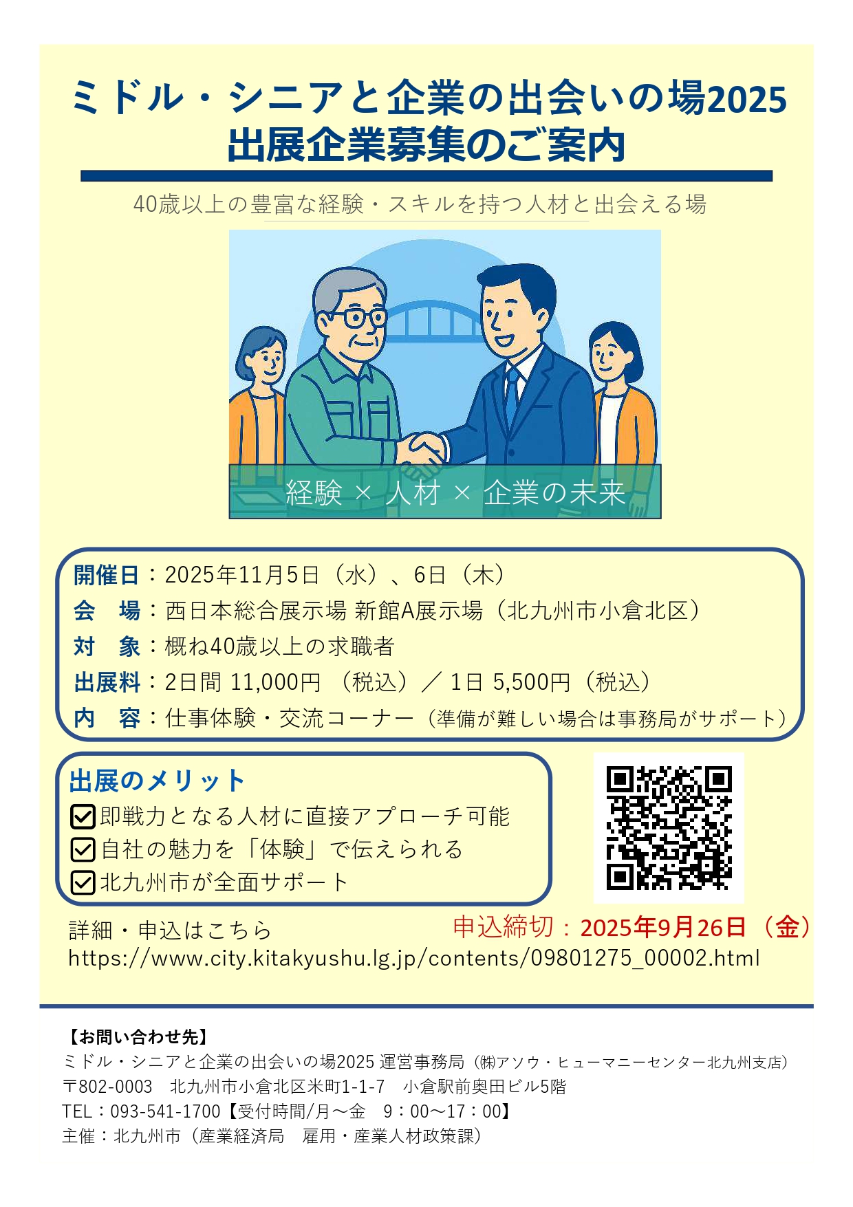 【出展企業募集】ミドル・シニアと企業の出会いの場2025/北九州市 産業経済局 雇用・産業人材政策課