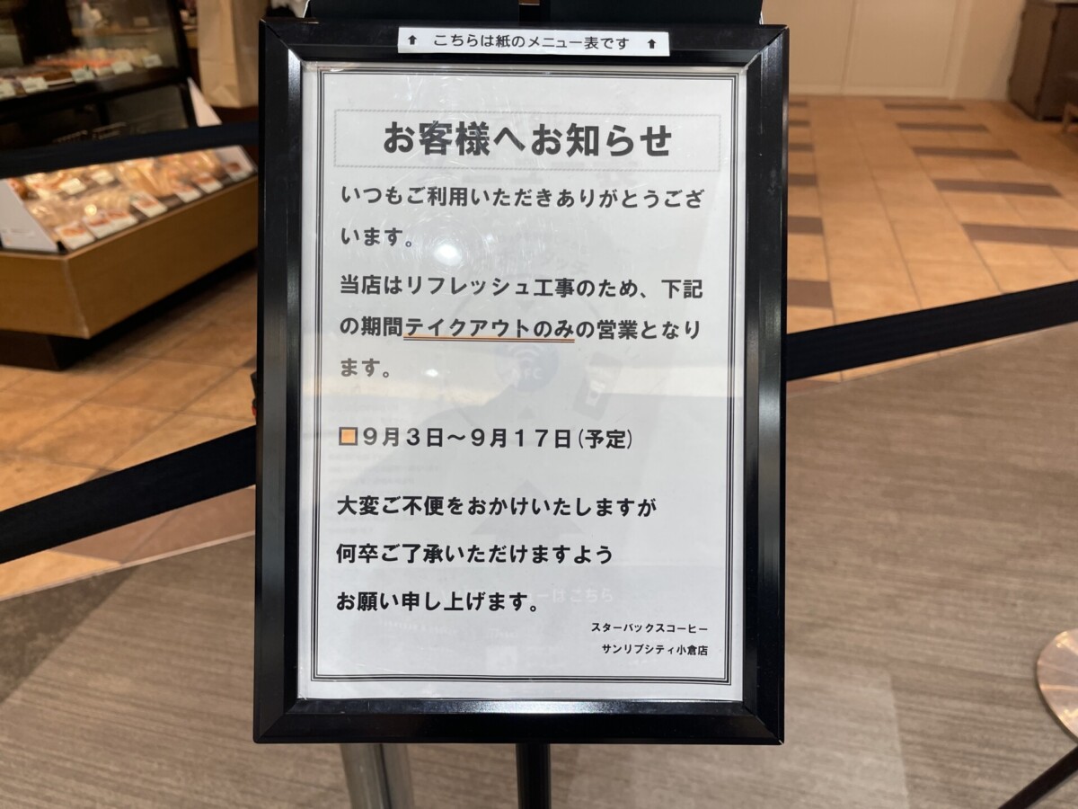 「スターバックスコーヒー サンリブシティ店」がリフレッシュ工事に伴い、9月17日までテイクアウトのみ対応して営業しています。