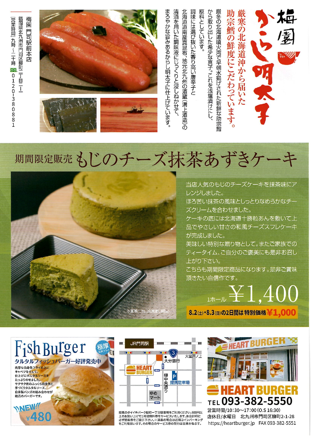 梅園門司駅前本店から徒歩1分にあるハートバーガーにて、梅園の明太子コラボメニューが期間限定で登場!プチプチとした食感でまろやかな旨みと辛さがたまらない梅園の明太子と、山椒昆布をご賞味いただける大変美味しいメニューです。コラボメニューならではの美味しさと、当店自慢の梅園の明太子をご自宅でもアレンジして作ってみませんか?