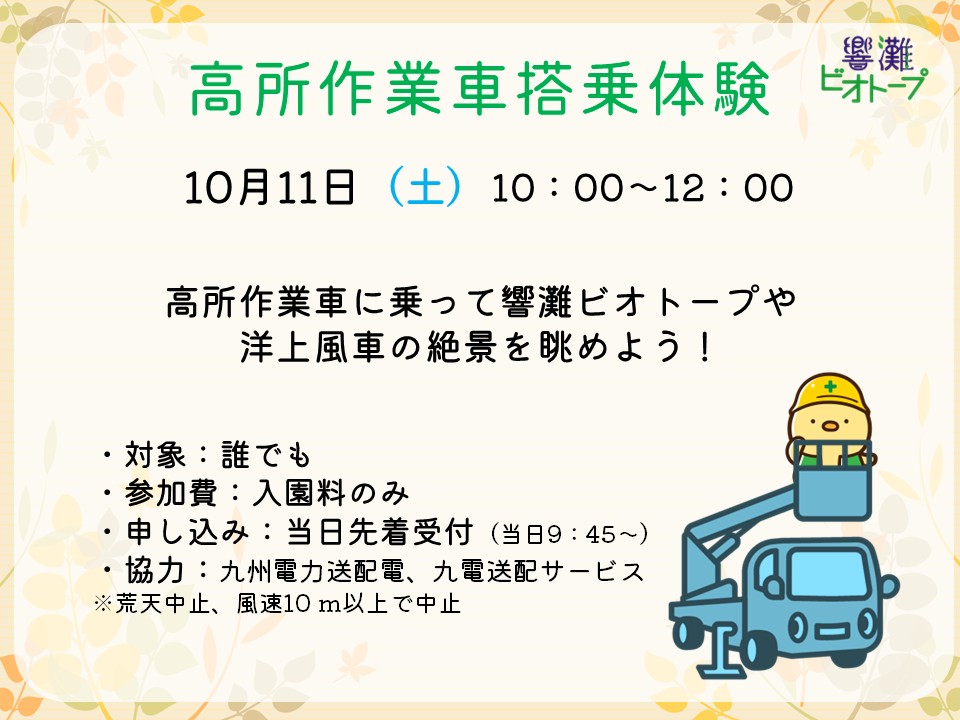 高所作業車に乗って響灘ビオトープや洋上風車の絶景を眺めよう!入園料のみで誰でも参加可能ですので、皆様お誘いの上ご参加ください。詳しくは画像をご覧ください。