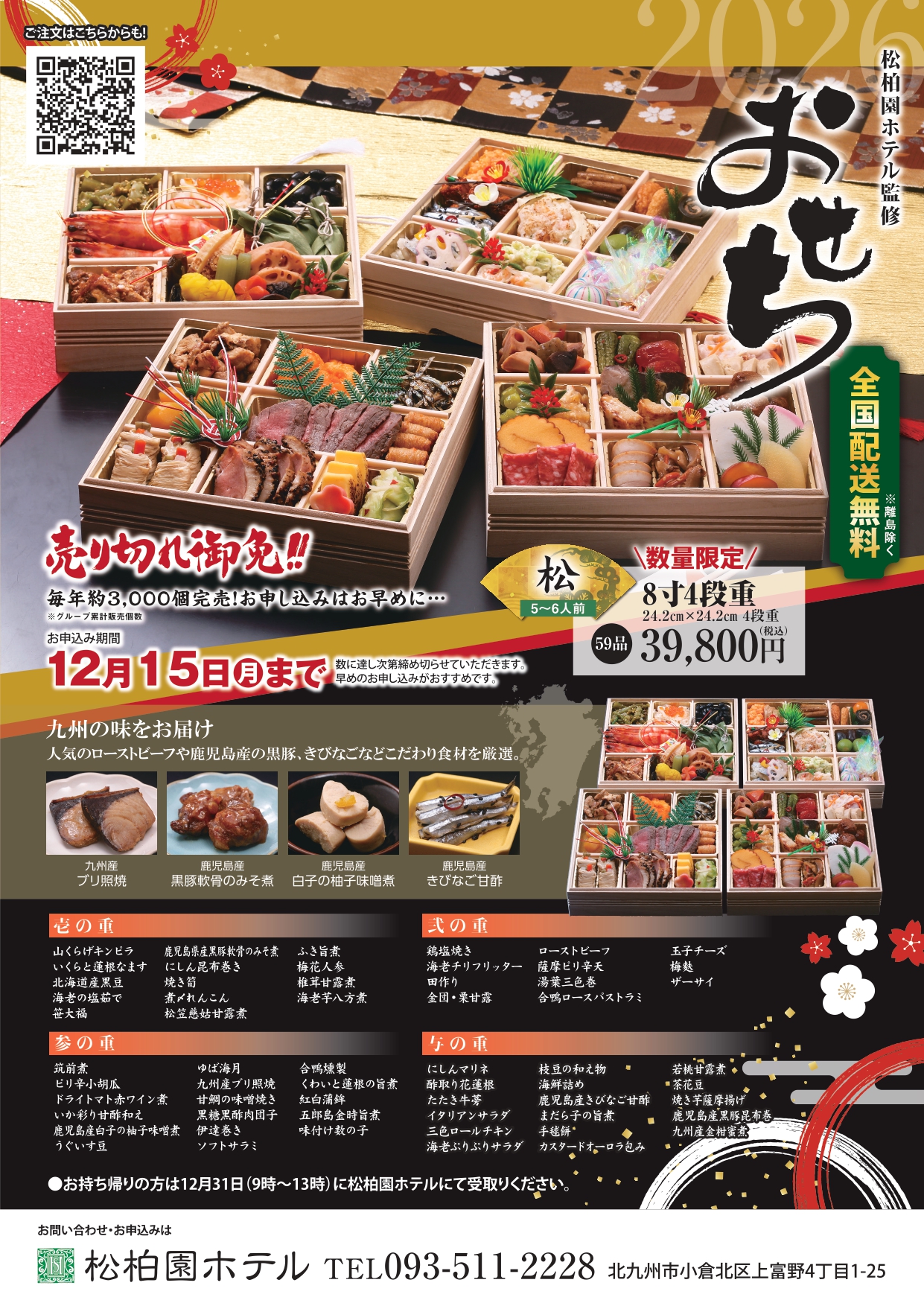 新しい年の食卓を彩る、松柏園ホテル特製の<おせち料理>。伝統の技に洋の華やぎを添え、今年は九州産の食材をふんだんに盛り込みました。華やかな三段重をはじめ多彩なラインナップをご用意し、冷蔵で全国へ直送いたします。祝いの席にふさわしい贅沢なおせちは数量限定。ぜひお早めにご予約ください。詳細・ご注文は公式サイトから。