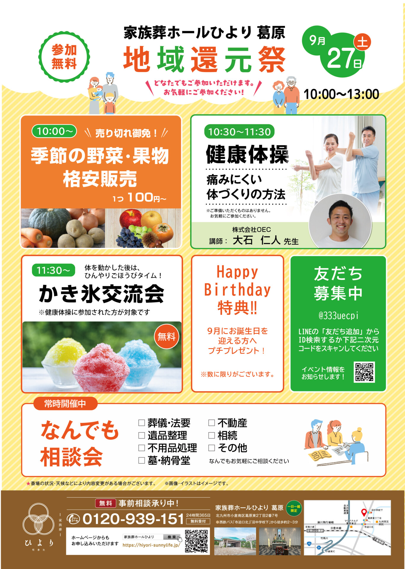 2025年9月27日(土)10:00~13:00、家族葬ホールひより 葛原にて「地域還元祭」を開催いたします!