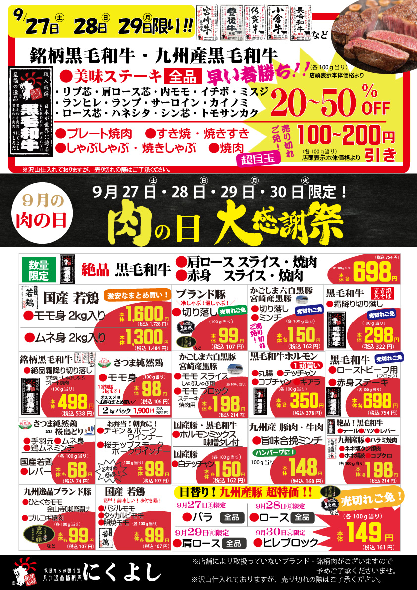 こんには!北九州の老舗精肉店にくよしです。本日は、29日で”肉の日”ですね!にくよしでは、『肉の日感謝祭』を9月30日迄開催しております。 特に29日は黒毛和牛がお買い得となっておりますので、お見逃しなく!その他にも目玉商品を多数揃えております!皆さまのご来店をお待ちしております!