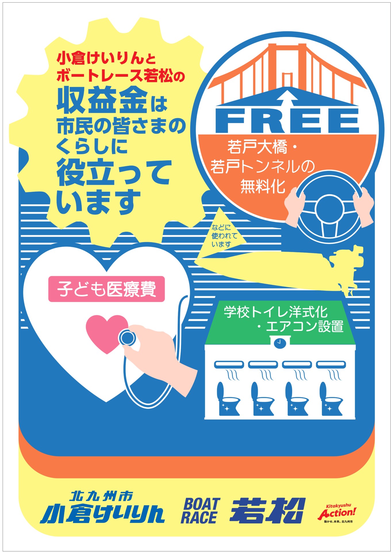 小倉けいりんとボートレース若松の収益金は、「若戸大橋・若戸トンネルの無料化」をはじめ、子どもさんが病院で診察を受けたときに発生する「子ども医療費」の支援、「学校のトイレ・エアコン整備」などに使われ、北九州市民の皆様のくらしに役立っています。収益金の活用先はその他にも!かねりんとかっぱくんのしりとりを見て、どんなところに活用されているのかチェックしよう!