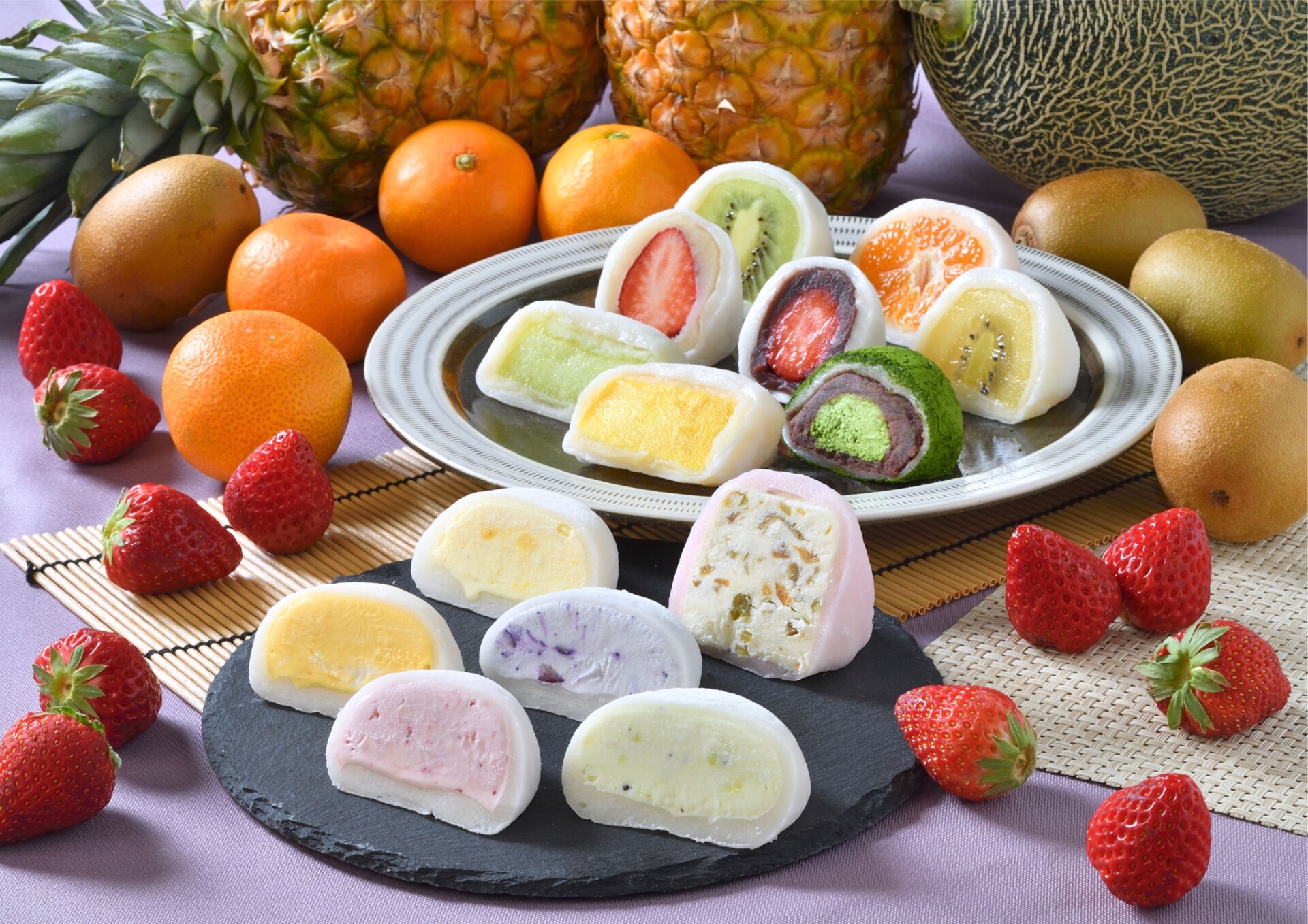 果実の瑞々しさと、ユキモンさんのアイスを職人仕立ての大福で包み込んだ涼の逸品★いちご、きうい、ブルーベリー、マンゴー、パインの5種類のアイス大福をご準備しております。是非お試しください♪