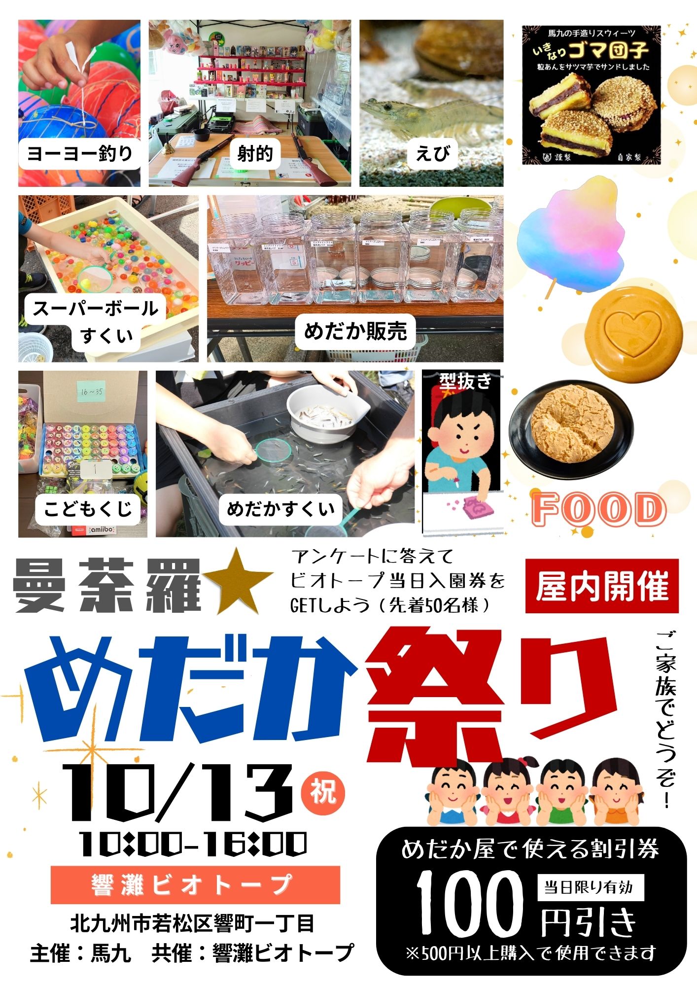 響灘ビオトープで<めだか祭り>を開催!様々な種類のめだか販売だけでなく、めだかすくいや射的など家族みんなで楽しめ、屋内開催なので気温や天候を気にせず遊べます!当日はキッチンカーもやってきます!出店内容など詳しくはリンク先をご覧ください。