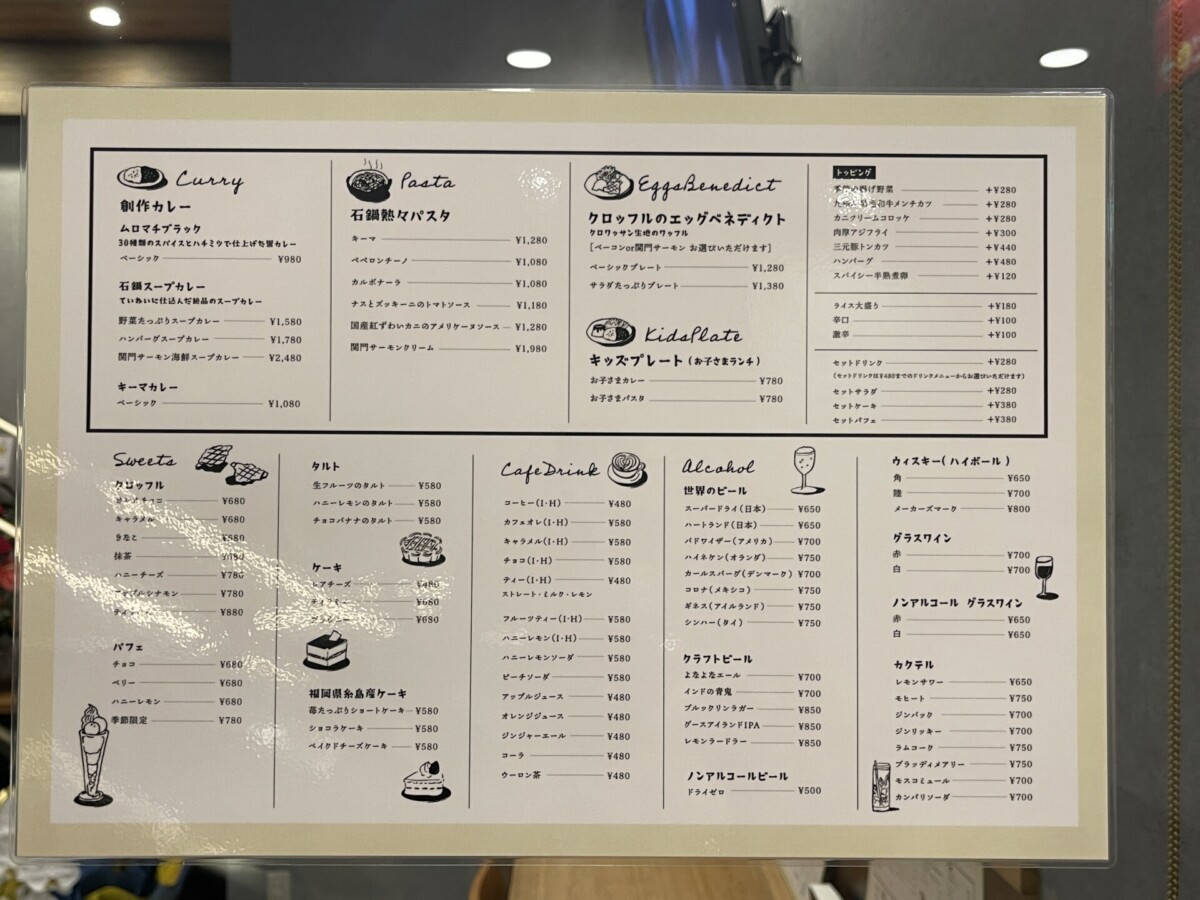 30種類のスパイスとハチミツで仕上げた黒カレー「ムロマチブラック」や「石鍋スープカレー」などがラインナップ。クロッフルやパフェ、タルトやケーキなど様々なスイーツも提供しています。