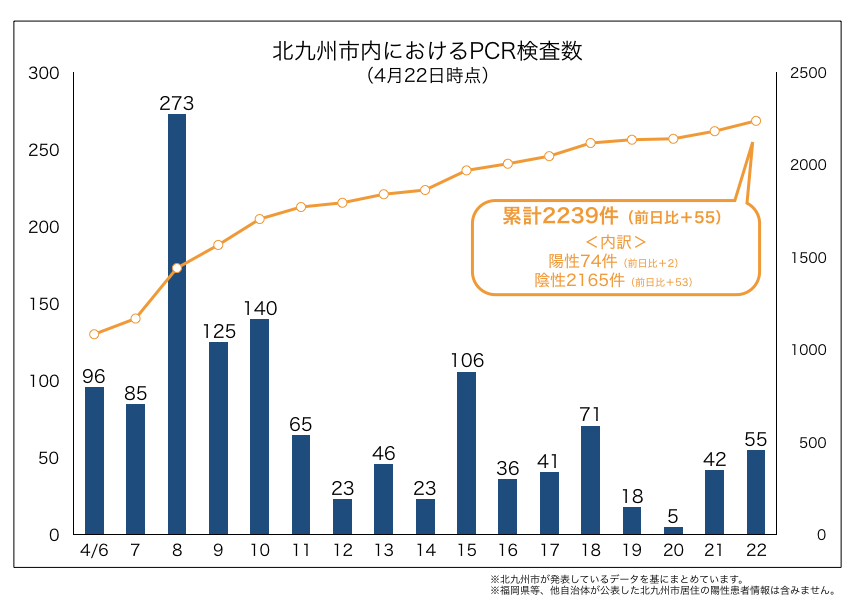 北九州市は、PCR検査を行った人数と、検査結果を連日発表しています。これによると、4月22日の市内の検査数は55件。累計は2239件となりました。陽性率は3.3%です。