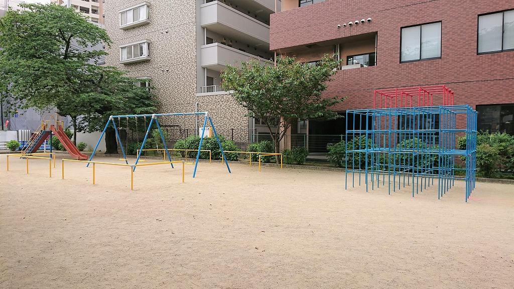 住宅街の中にある黄金公園には、滑り台、ブランコ、ジャングルジムといったシンプルな遊具のほか、広々とした砂場があります。