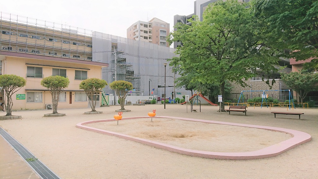 「こがね市場商店街」のそばに位置する「黄金公園」(北九州市小倉北区黄金1丁目)。公園内には黄金公民館もあり、地元住民の交流の場としても利用されています。
