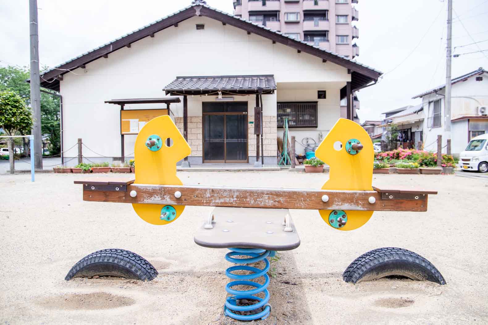 すべり台と砂場と木製のシーソーがあるものの、遊び場としては少し小さめの公園ですが、公園内には神社もあります。