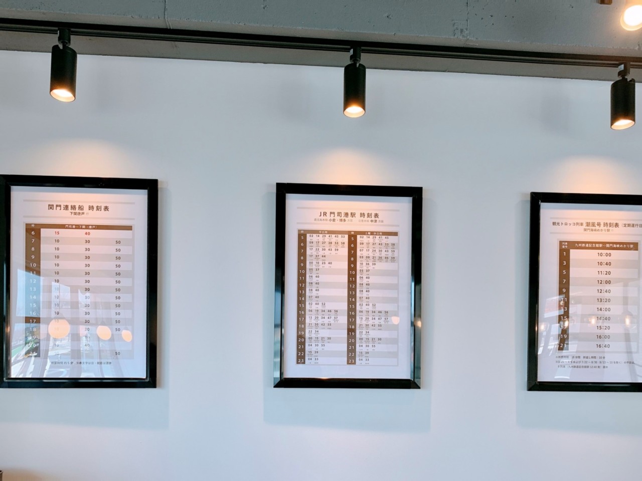 店内に額縁を発見。よく見ると、JR、関門連絡船、観光トロッコ列車の時刻表でした。