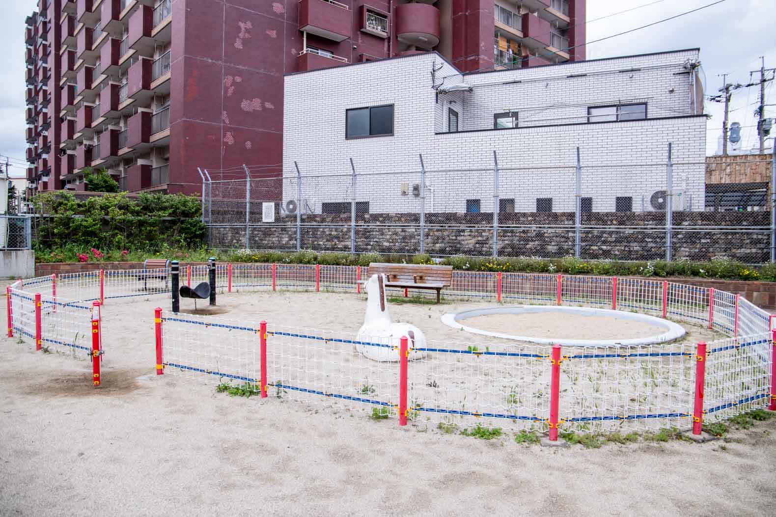 砂場には、子どもを見守る時に便利なベンチがあります。一人で歩けるようになったくらいの子どもが遊ぶときに心配なのが、急にどこかにいってしまうこと。道路に急に飛び出てしまわないように、柵があるのでと安心できますね。ハンモックのような不思議な遊具もありましたよ。