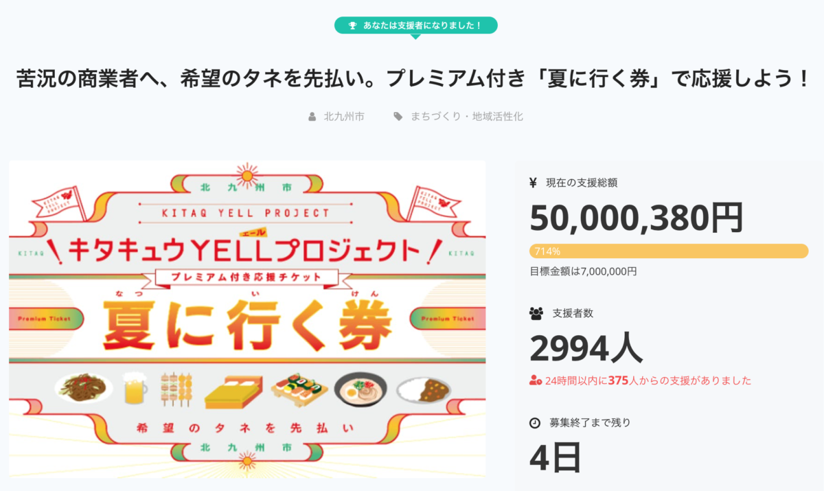 先日、市が中心となって取り組んでいる飲食店等の支援事業「キタキュウYELLプロジェクト」についての記事を公開しました。同プロジェクトは、1口5000円でクラウドファンディングに参加すると、指定した店舗で使用可能なチケット「夏に行く券」が、支援金額の20%増しでもらえるというもの。5月4日16時現在で、およそ3000人から5000万円もの支援が集まっています。