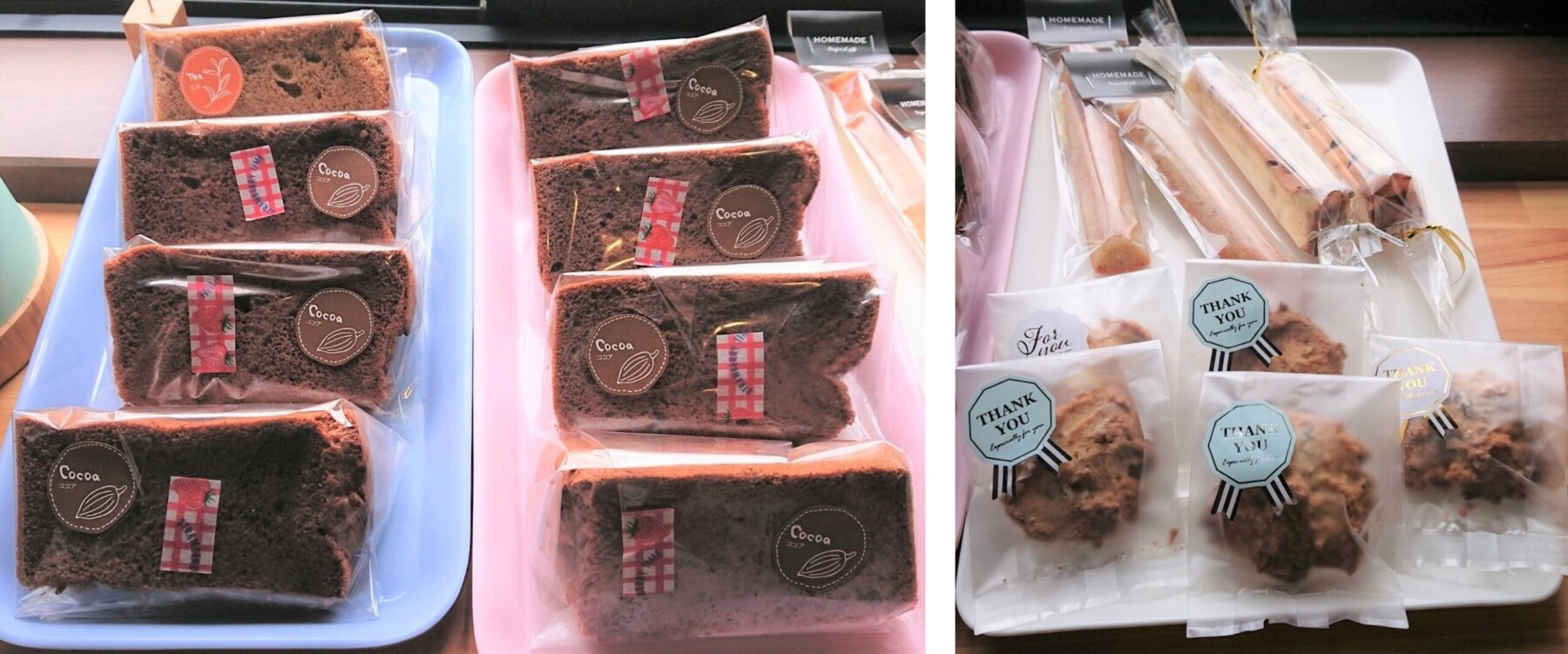 スイーツは八幡西区の自宅お菓子教室「mignonne(ミニョン)」のお菓子で、マフィンやクッキー、スコーンなど、いろいろなお菓子が日替わりで店頭に並びます。中でも一押しは、ふわふわの「絹どけシフォンケーキ」とのこと。お菓子ごとに、砂糖や粉の種類を変えているというこだわりスイーツは手土産にも喜ばれそうです。