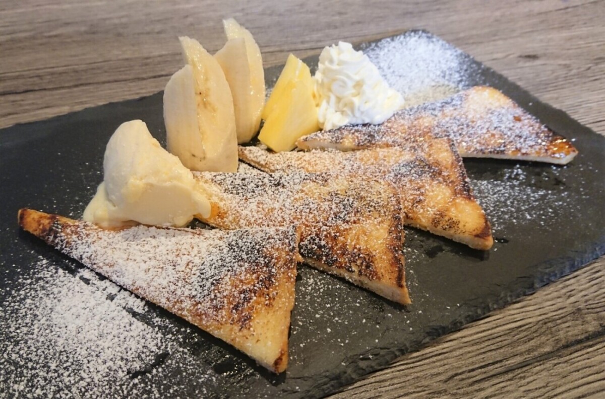 注文から程なく、フレンチトースト4切れ、バニラアイス、生クリーム、バナナ、パイナップルが1皿に盛りつけられたものが運ばれてきました。