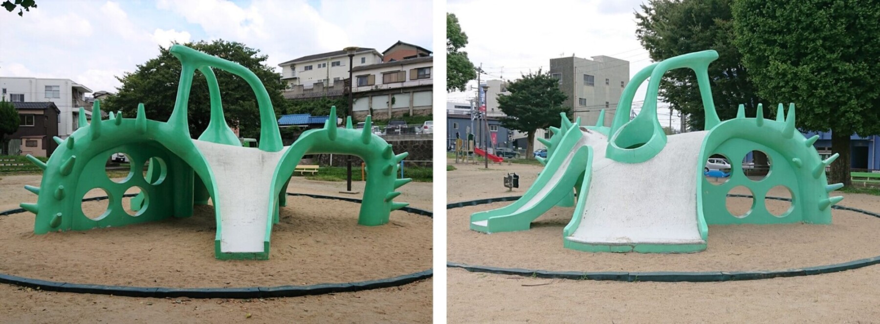 トゲトゲがたくさんある緑色のすべり台は、表から見ても裏から見ても何をデザインしているものなのか分からないのですが、こんなすべり台はこれまで見たことがなく、強烈な印象を残してくれます。