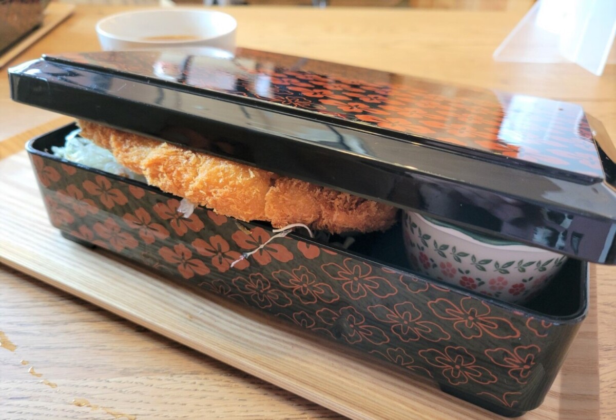 ふたが閉まり切れないほどボリューム満点「甘熟ロースカツランチ」