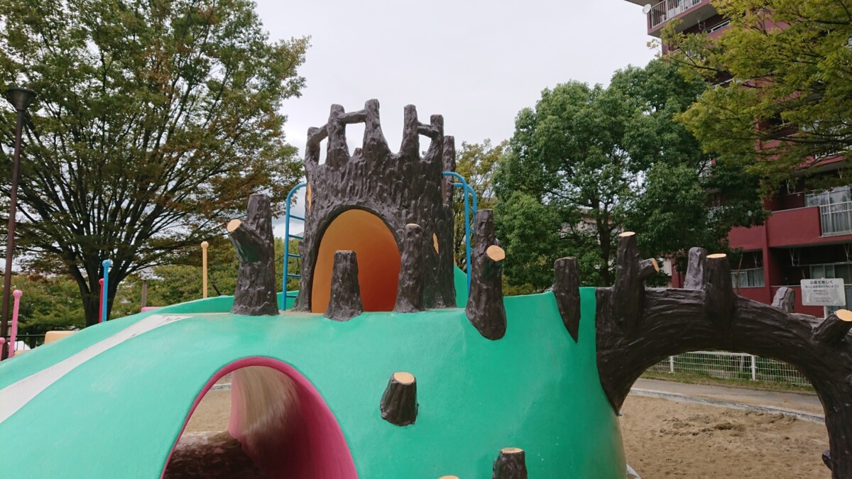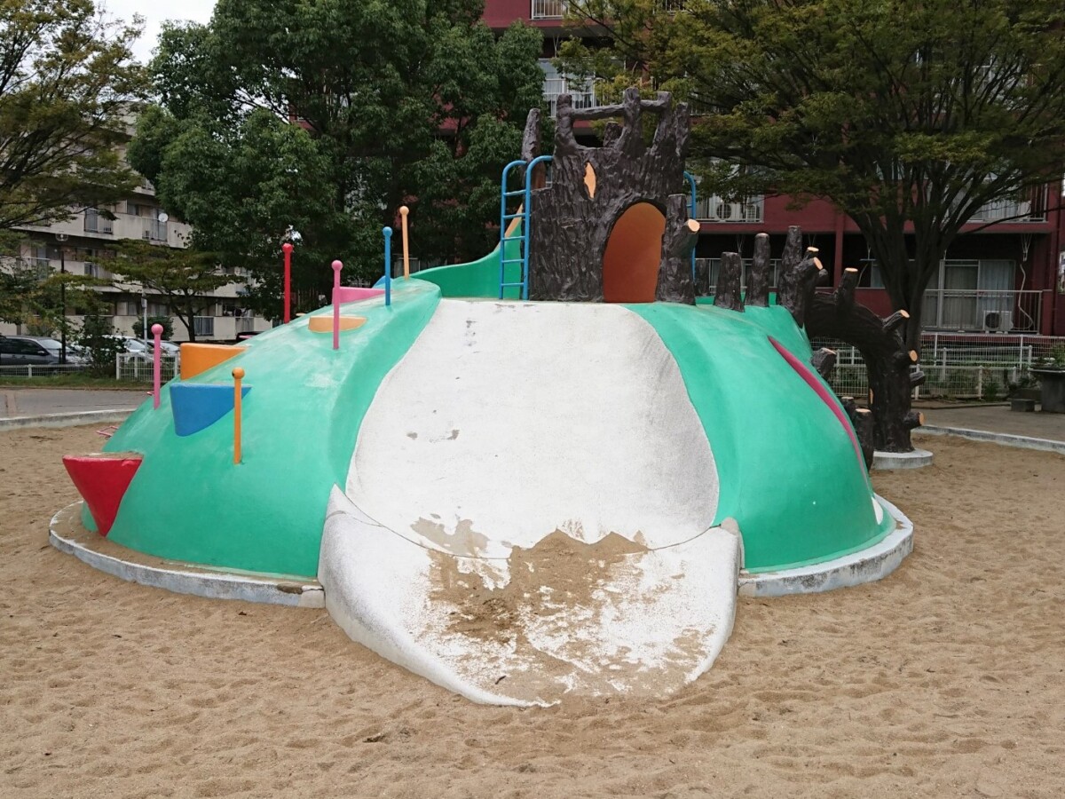 遊具は、コンクリート製のすべり台と砂場、それとすべり台やブランコなどが組み合わされたコンビネーション遊具があるのですが、とにかく目立って仕方ないのがカラフルなコンクリート製のすべり台です。