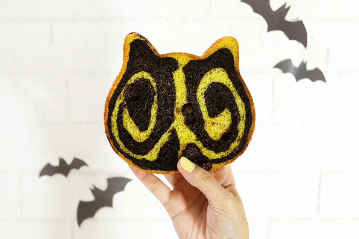 ハロウィンをイメージしたブラックとイエローの目を引くビジュアルの「ねこねこ食パン〜ハロウィン〜」は、パンプキン風味の生地と、レーズンやチョコを入れたブラックココア生地で焼き上げられています。ブラックココアはほんのりビターな味わいですが、ねこねこ食パン特徴のミルク100%の生地と合わさり、ミルキーで甘みを感じられる味わいに仕上がっています。