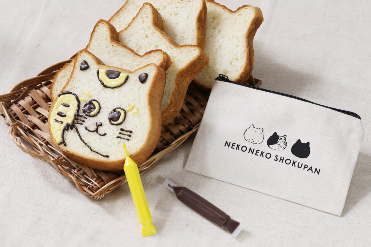 9月29日(水)から数量限定で販売されるのは、“ねこねこポーチ”付きの「豪華まねきねこセット」(1540円)。ねこねこ食パン(プレーン)1個、ねこねこポーチ1枚、チョコペン(ブラック)1本、チョコペン(きいろ)1本がセットになっています。
