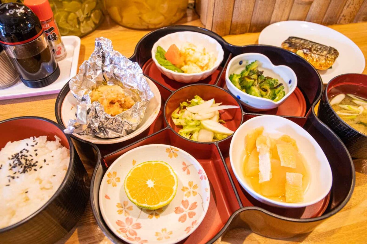 席に座り、おしぼりとお茶が運ばれてきたかと思ったら、すぐに副菜たちが目の前に運ばれてきました。品数と安さはもちろんですが、提供時間の早さにも驚かされます。これだけスピーディーだと、休み時間の間に来店するオフィスワーカーたちにも喜ばれそうです。