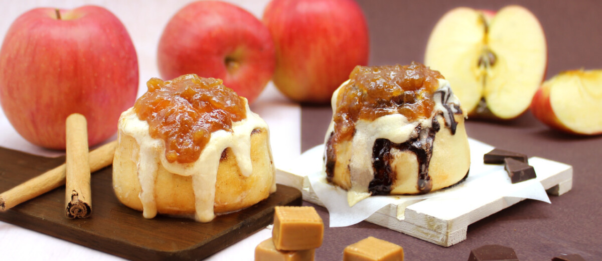 「キャラメルりんごミニボン」は、定番商品「シナボンクラシックロール」のミニバージョン「ミニボンクラシック」に、ごろっと果肉が入ったキャラメル風味のりんごのコンフィチュールをトッピング。甘酸っぱいりんごと相性の良いシナモンのハーモニーを楽しむことができます。