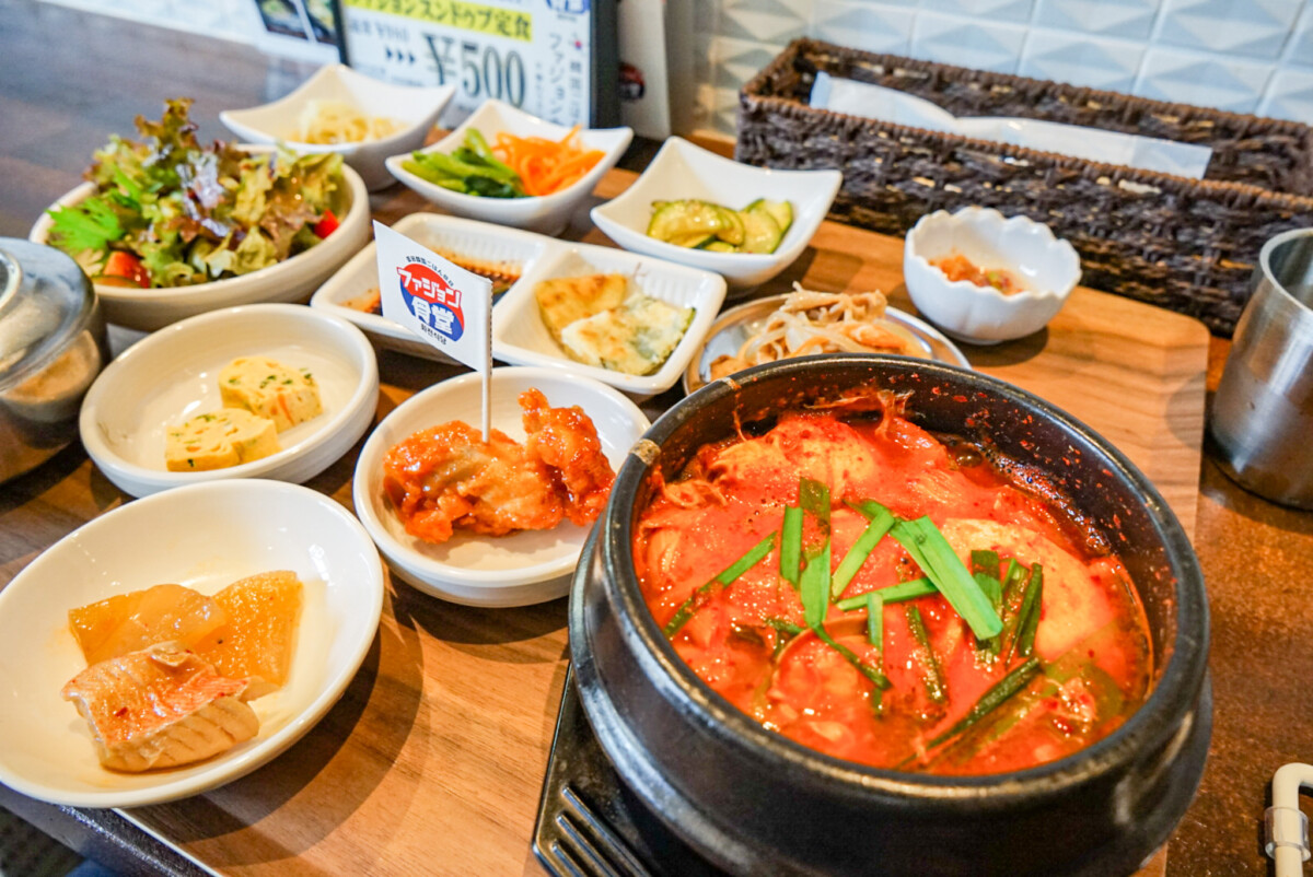 今回紹介するのは、ランチメニューの「スンドゥブ定食」(1078円)。メインのスンドゥブは具材がしっかり入っているので、食べ応え十分。定食には本場韓国の食堂のように惣菜がたくさんついており、取材日は、ナムル4種とチヂミ、サラダなど、10品以上がズラリと並びました。惣菜は日替わりで内容が変わるとのことです。