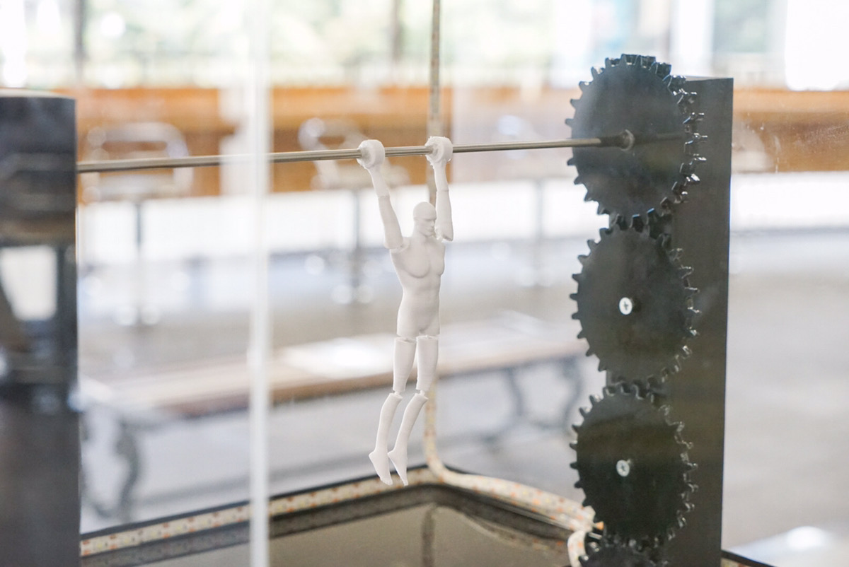 「『世界体操・新体操選手権』SDGs体操発電システム」という作品で、ハンドルを回すとケースの中の人形が鉄棒の「大車輪」の演技をしながら発電し、ケースのイルミネーションを点灯させるというもの。SDGsの目標7「エネルギーをみんなに。そしてクリーンに」を意識した作品です。