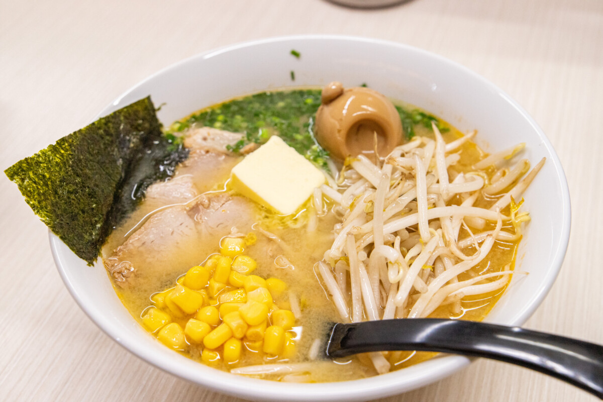 ストレートの細麺に、あっさりした味わいのスープがよく合う「みそラーメン」を、さらに食べ進めるとトッピングのバターが後から溶け出し、味を変えてくれるので一度に二度おいしく楽しめます。ラーメンだけでも十分な量はありますが、ライス(小・中)も追加で注文可能です。