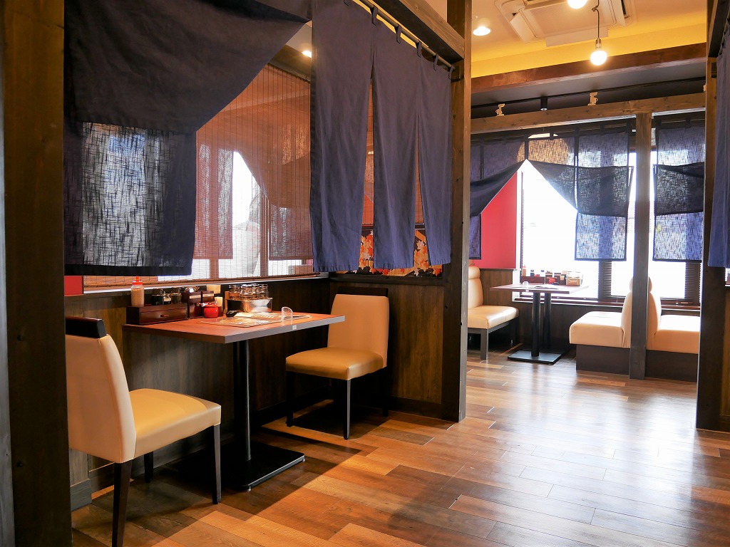 陣原店は、カウンター席・テーブル席合わせ、全60席のロードサイドの大型店舗です。ソーシャルディスタンスを保てるよう、仕切りや区切りなどを工夫し、“個室感”を意識した設計。ファミリーでゆっくり座れる広々としたテーブル席から、1人でじっくり味わいたいという人にお勧めのカウンター席まで、幅広く利用しやすくなっています。