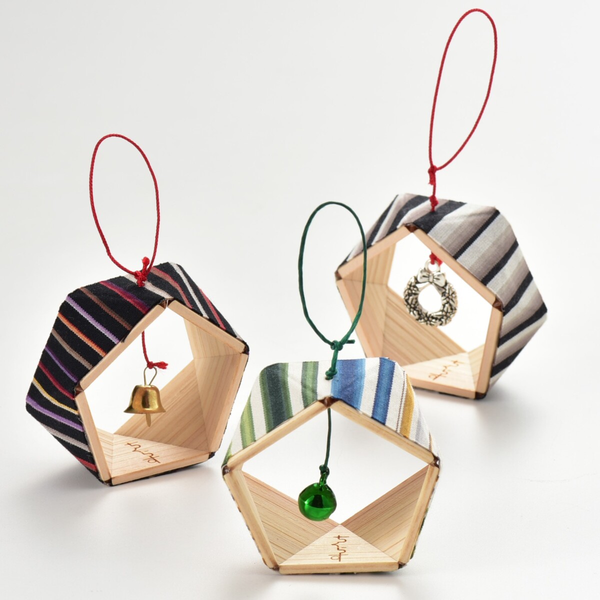 今年はコロナ禍の影響で、当たり前に逢える大切さを改めて感じる機会が多かったことから、“逢える願いを込めた星”をオーナメントの形に採用。京築ヒノキと小倉織(小倉縞縞)の端切れを使い、立体的なデザインで星を表現しています。