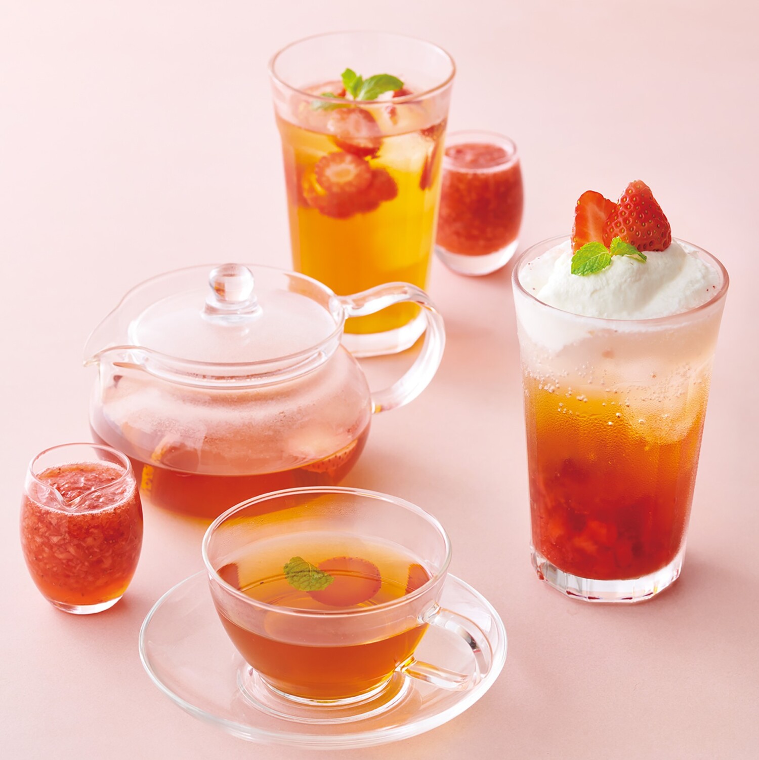 「苺のスパークリングティー」は、「アフタヌーンティーブレンド」のティーソーダにハイビスカスティーゼリーとイチゴをトッピング。「苺づくしのフレッシュストロベリーティー」は、フレッシュなイチゴを浮かべた「ストロベリーダージリン セカンドフラッシュブレンド」に自家製イチゴジュースをたっぷり加えて楽しむ一品です。