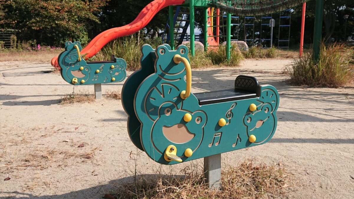 コンビネーション遊具のそばには、ゆらゆら揺らして遊ぶスイング遊具が2体設置されていますが、そのデザインは2体ともカエル。合唱中のカエルたちが顔をのぞかせる楽しいデザインに、子どもたちの心も弾むことでしょう。