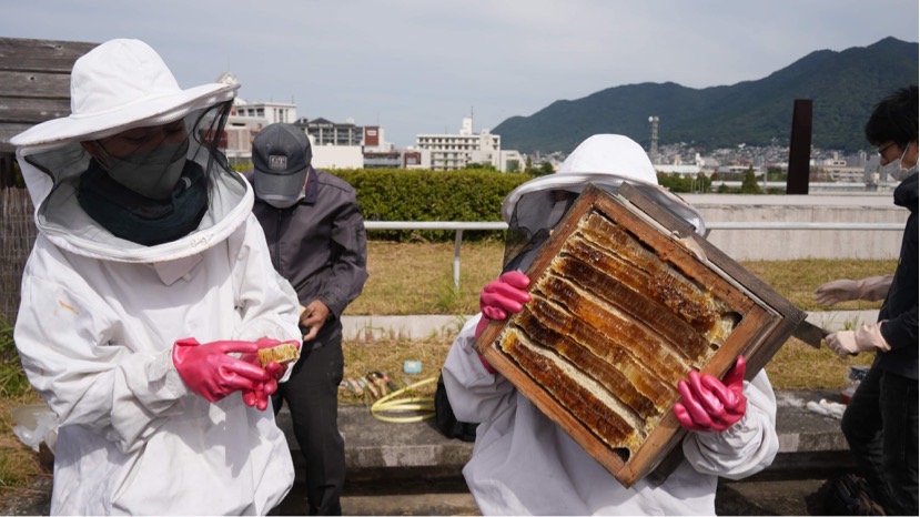 二ホンミツバチの養蜂を通じて人の暮らしと自然環境を考えるために、さまざまな活動を行っている「放課後みつばち倶楽部」。2012年から小倉南区の北九州市立大学北方キャンパス本館の屋上でニホンミツバチの養蜂を続けており、巣箱づくりから採蜜、瓶詰、販売まで、すべての工程を学生たちの手で行っています。