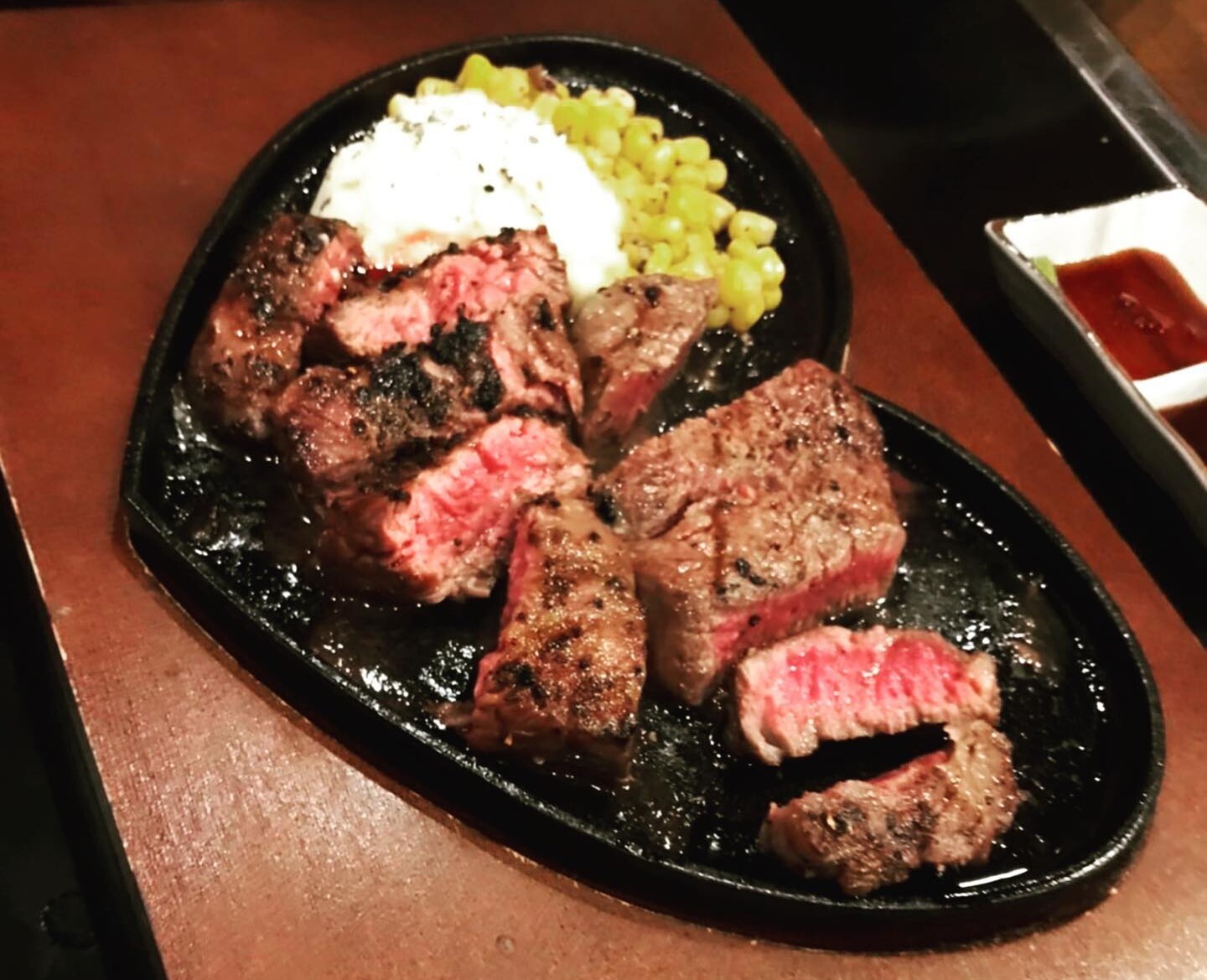 ステーキの部位は、赤身と適度に脂身のあるお肉、2種類を置くようにしているそうで、仕入れの状況により、ヒレ、ハラミの場合や、ヒレ、リブの場合もあるとのこと。また、ソースも自家製で、わさびを添えて、玉ねぎなどが入った和風ソースと、赤ワインベースの洋風ソースで提供していると言います。